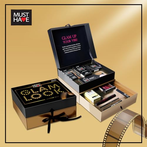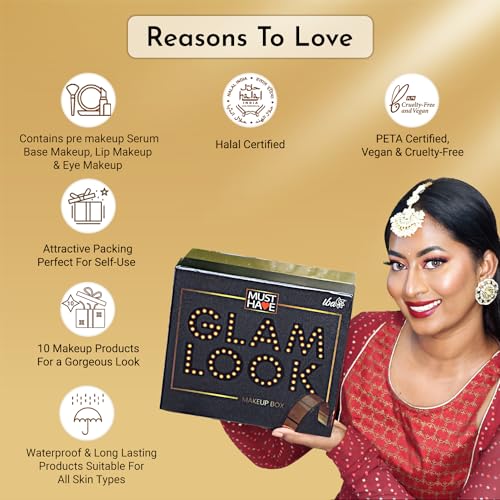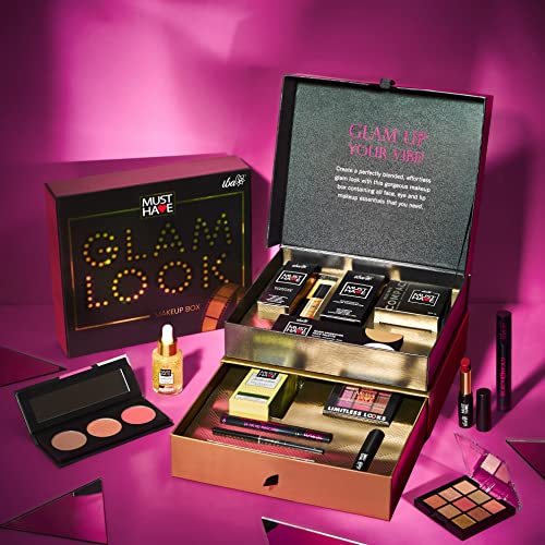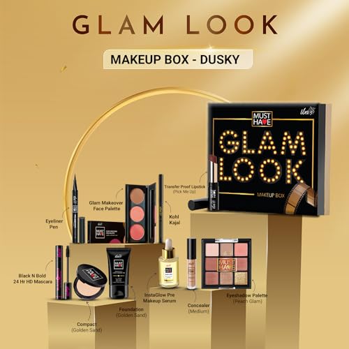 Iba Must Have Glam Look Makeup Box Dusky for Women | Pre Makeup Serum | Waterproof Foundation | Matte Compact | Concealer | Transfer Proof Lipstick | 3 in 1 Face Palette with Blush Highlighter Contour | 9 in 1 Eyeshadow Palette | Smudge Proof Kajal | Eyel
