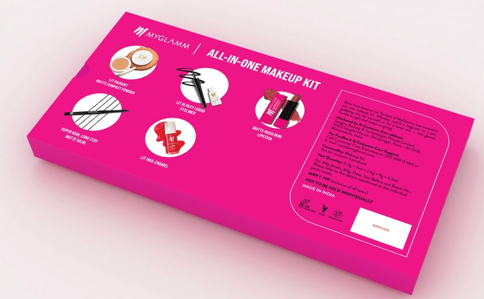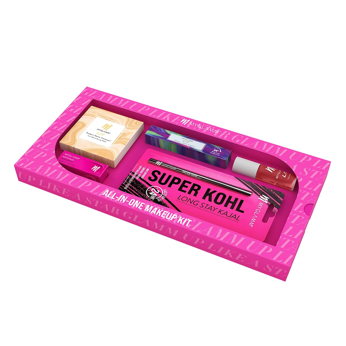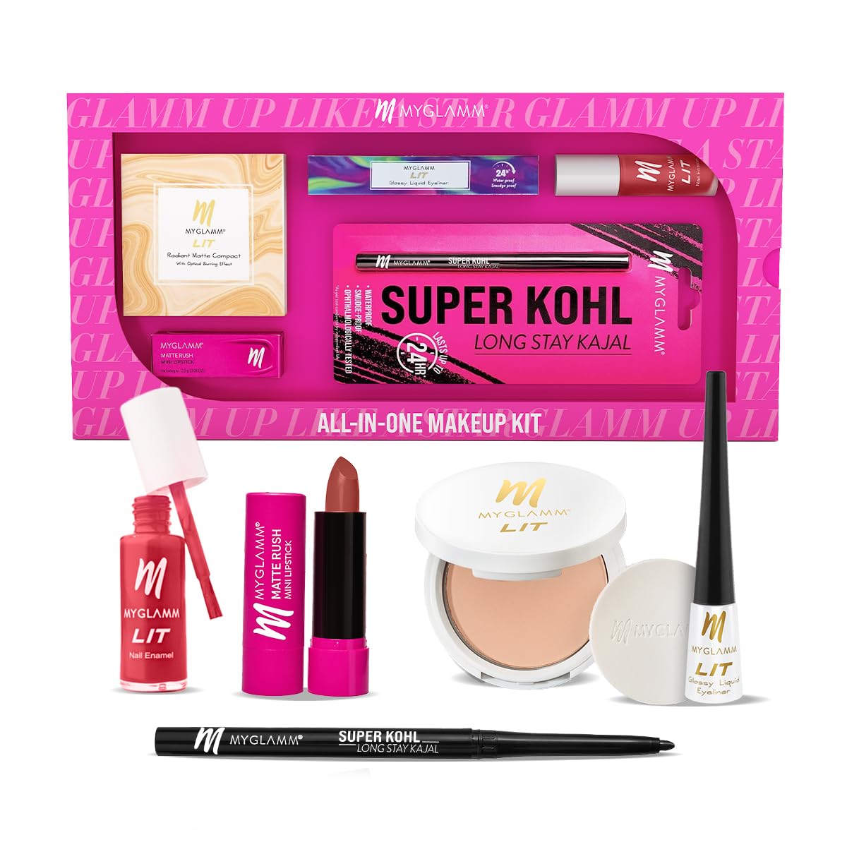 Here's your new go-to makeup kit to get your glamm on. Minimal everyday or a glamm night makeup look - this kit has got your back! Super Kohl Long Stay Kajal for eyes that âscream' drama LIT Radiant Matte Compact Powder to perfect your base LIT Matte Rush Mini Lipstick for statement lips LIT Glossy Eyeliner to wing it like you mean it LIT Nail Enamel for salon-like manis at home