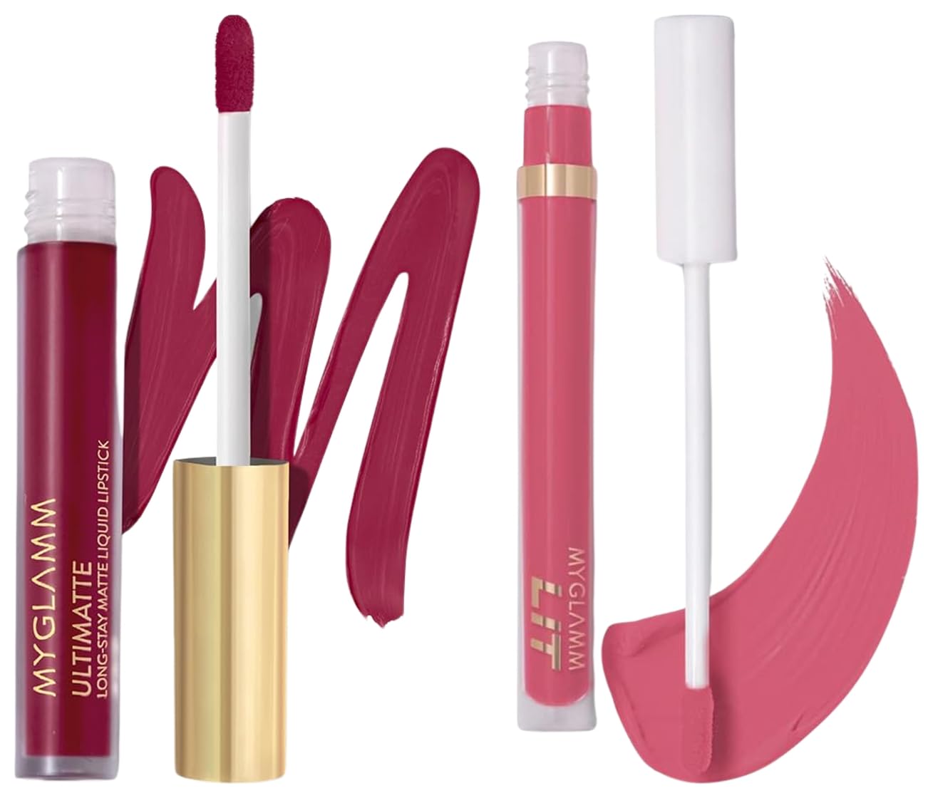 MyGlamm LIT Liquid Matte Lipstick-Like a G6 (Brown & Nudes)-3 ml | With Moringa Oil | 12HR Long-lasting Lipstick | Cruelty-Free Matte LipstickYou found The One! Trust us ladies this liquid matte lipstick will be your new love! The LIT Liquid Matte Lipstick by MyGlamm gives you soft kiss-proof lips no smudges or transfers just pure intense colour! Best of all it's enriched with Moringa Oil that moisturises and smoothens dry damaged lips.MyGlamm Ultimatte Long Stay Matte Liquid Lipstick - Berry Charmer (Wine) | Long Lasting Lipsticks for Women with 8hr Stay | No-Smudge & Waterproof | Intense Colour | Moisturising Formula | 2.5mlThe MyGlamm Ultimatte Long-Stay Matte Liquid Lipstick is a highly-pigmented miracle formula enriched with Vitamin E and glides on easily resulting in a matte finish that doesn't settle into lip lines. In just a single stroke it'll give you a full burst of color that lasts for up to 8 hours while keeping your lips well-hydrated and nourished â making it the perfect choice for everyday wear.