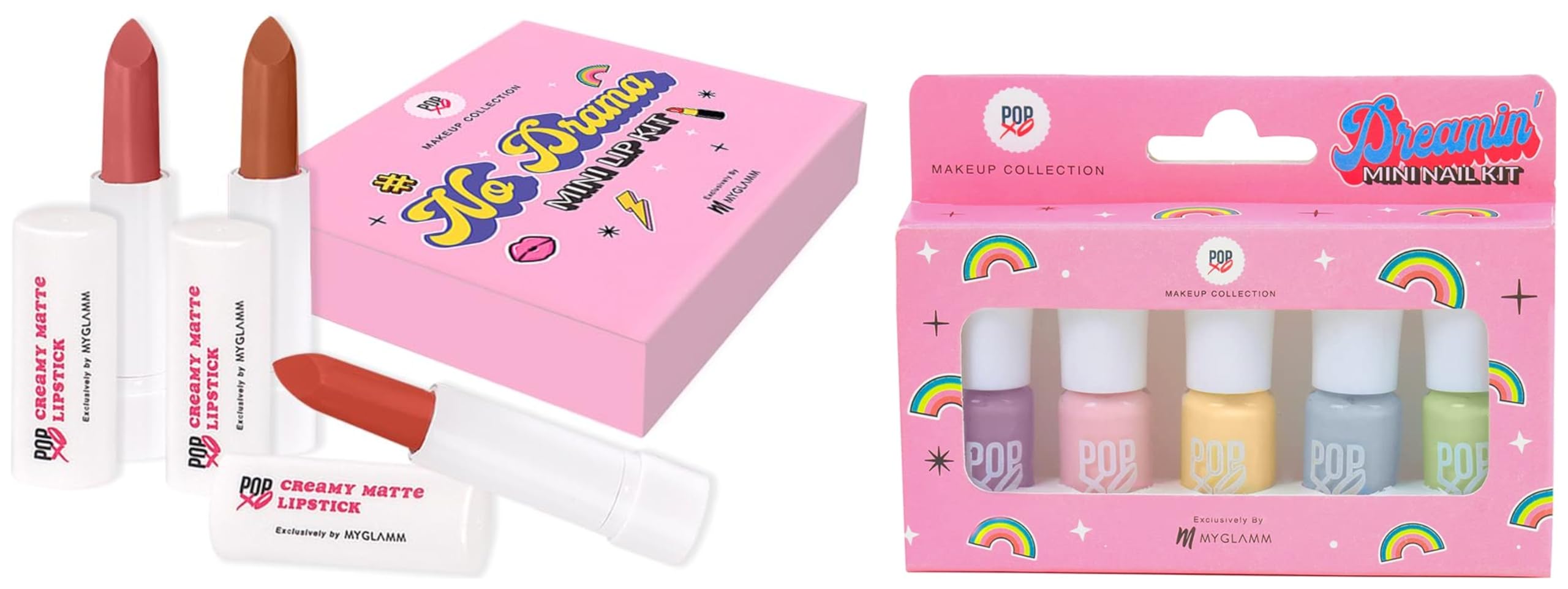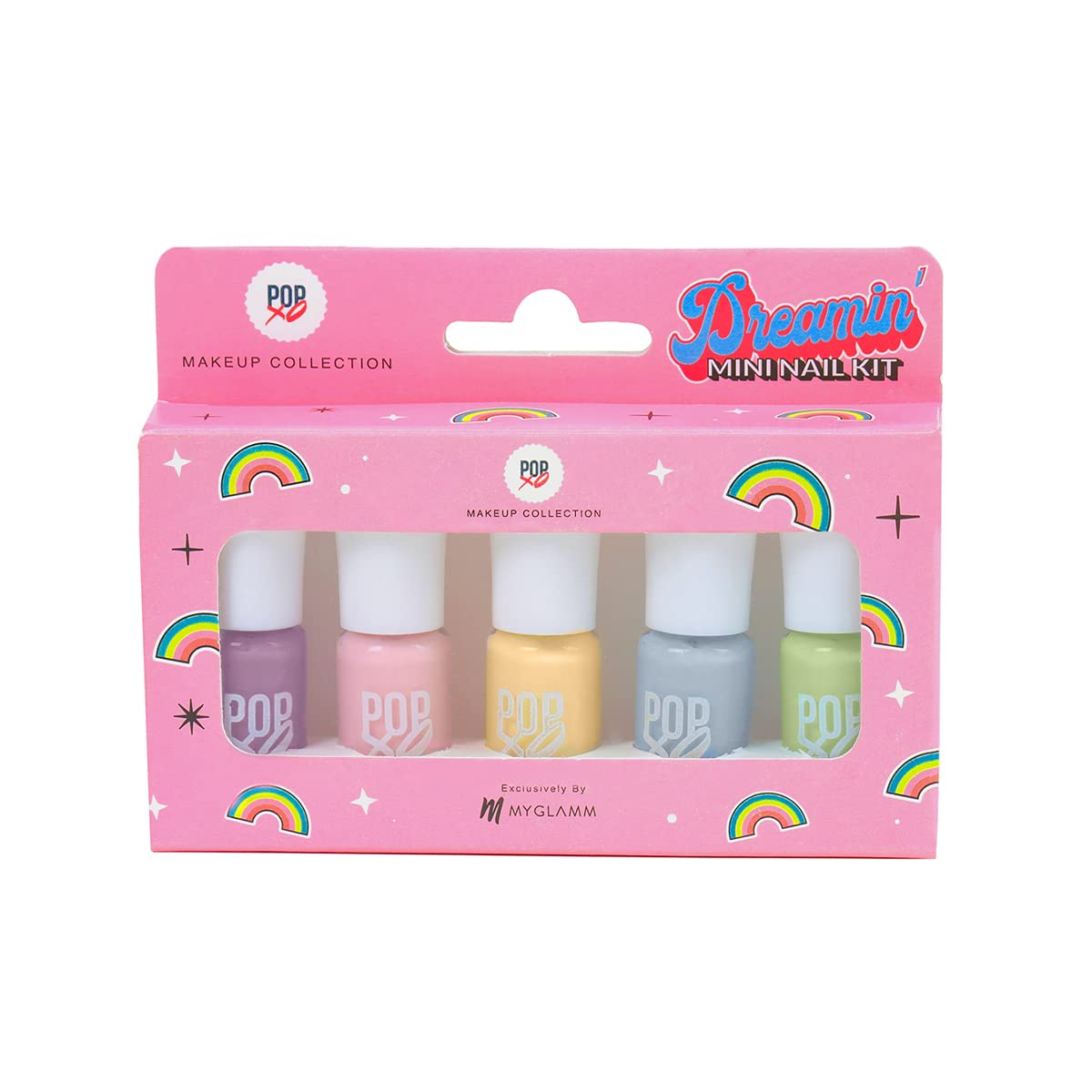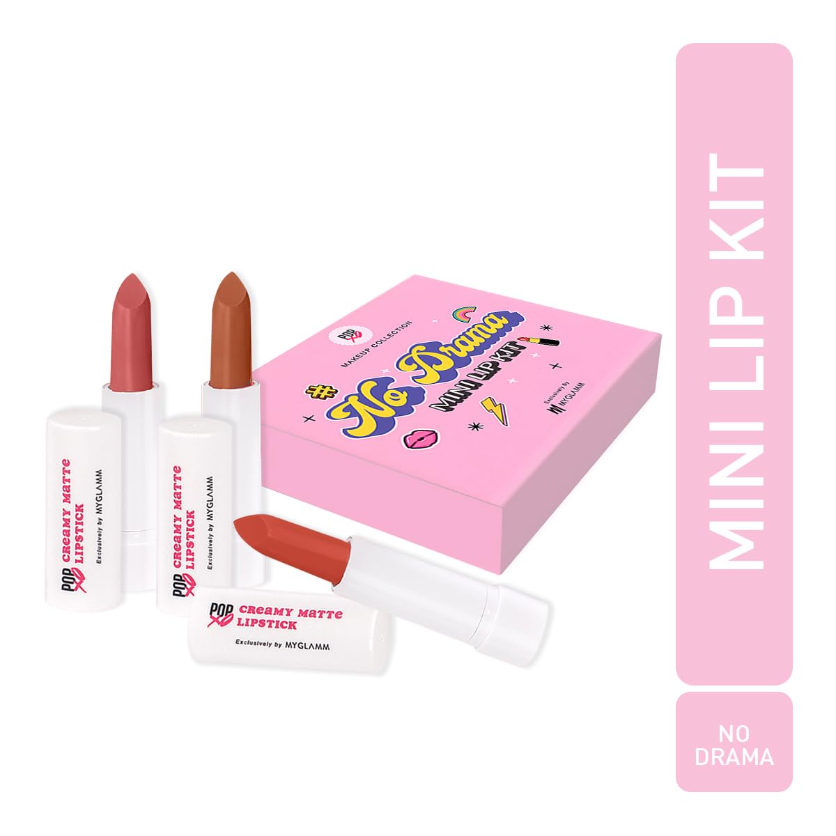 MyGlamm POPxo Makeup Collection No Drama Mini Lip Kit Lipstick Nude Lipstick Crème Finish Paraben Free Long Lasting Formula 3 in 1 Combo 7.5gm (Pack of 3)Save the drama for your mama! No Drama - Mini Lipstick Kit is a set of 3 gorgeous creamy-matte nude lipsticks that will add a little extra something to your #NoMakeup selfies. No-fuss no-frills just dreamy lippies that you can pair with just about anything. This mini lip kit includes 3 irresistible nude lipsticks - one for every mood duh. The lipsticks have a creamy matte formula that glides on the lips smoothly and wears comfortably for long hours. The pigmented formula delivers rich colour payoff in one swipe and is designed to be suitable for all Indian skin tones. "I have too many lipsticks" - said no one ever! That's because we know the real power of a good lipstick on a bad day.MyGlamm POPxo Makeup Collection -Mini Nail Kit-Dreamin'-5X3ml Pastels Glossy FinishDaydreamin' in pastels. Daydreamin' is a stunning set of 5 chip-resistant pastel mini nail polishes that is all you need to stay winning at your manicure game. These pastel beauties are totally worth #Simping for. Always having a set of freshly painted nails is every girl's ideal state of living. While frequent salon visits can be heavy on the pocket there is one fun trick that won't break the bank. Bring the priceless feeling of new nails home with POPxo Makeup Collection's Daydreamin' Mini Nail Kit. This mini nail polish set includes 5 nail paints in trendy pastel colours that are perfect for acing the soft girl vibe. These mini nail polishes have a chip resistant formula and offer a long-lasting wear. They have a high gloss finish and make your digits look oh-so-fab. So are you ready to be your own nail technician?