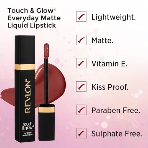 Revlon Touch & Glow Everyday Matte Liquid Lipstick|Lightweight, Transferproof, Kiss Proof, Non Sticky infused Vitamin E|Parabeen & Sulphate free -Maroon Monarch