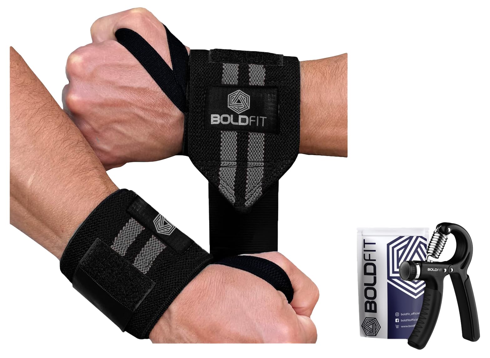 Boldfit Adjustable Hand Grip Strengthener Hand Gripper for Men & Women for Gym Workout Hand Exercise Equipment to Use in Home for Forearm Exercise Finger Exercise Power Gripper (5-40 Kg) BlackBoldfit forearm strengthener heavy-duty stainless steel spring can easily adjust the grip between 10-60kg the comfortable and durable handle increases training goals. The wrist exercise equipment - hand Gripper is suitable for everyone like Athletes sports fitness coaches fitness musicians and people who want to exercise their hand wrist and fingers. People who use the mouse and keyboard for a long time may experience pain and stiffness in their joints. The gripper for gym can promote blood circulation in the hands. The grip device can not only increase strength but also can be used for rehabilitation training after injury promote blood circulation and help restore hand strength. Use anytime anywhere: Easily fits into your gym bag or handbag you can use it in home office gymnasium or classroom.Boldfit Wrist Supporter for Gym Wrist Band for Men Gym & Women with Thumb Loop Straps - Wrist Wrap Gym Accessories for Men Hand Grip & Wrist Support Sports Straps for Gym Weightlifting - (Grey)With the Boldfit gym straps for weight lifting you can grip firmly even the heaviest of weights. Not only that but you also get to increase gains and achieve all your fitness goals start lifting heavier weights with the help of boldfit hand band for gym. Increase stability and balance during deadlifts shrugs bench press overhead or shoulder press cleans jerks planks burpees dumbbells and more. With these wrist band for men sports you can increase gains increase grip strength and achieve your fitness goals like a pro.