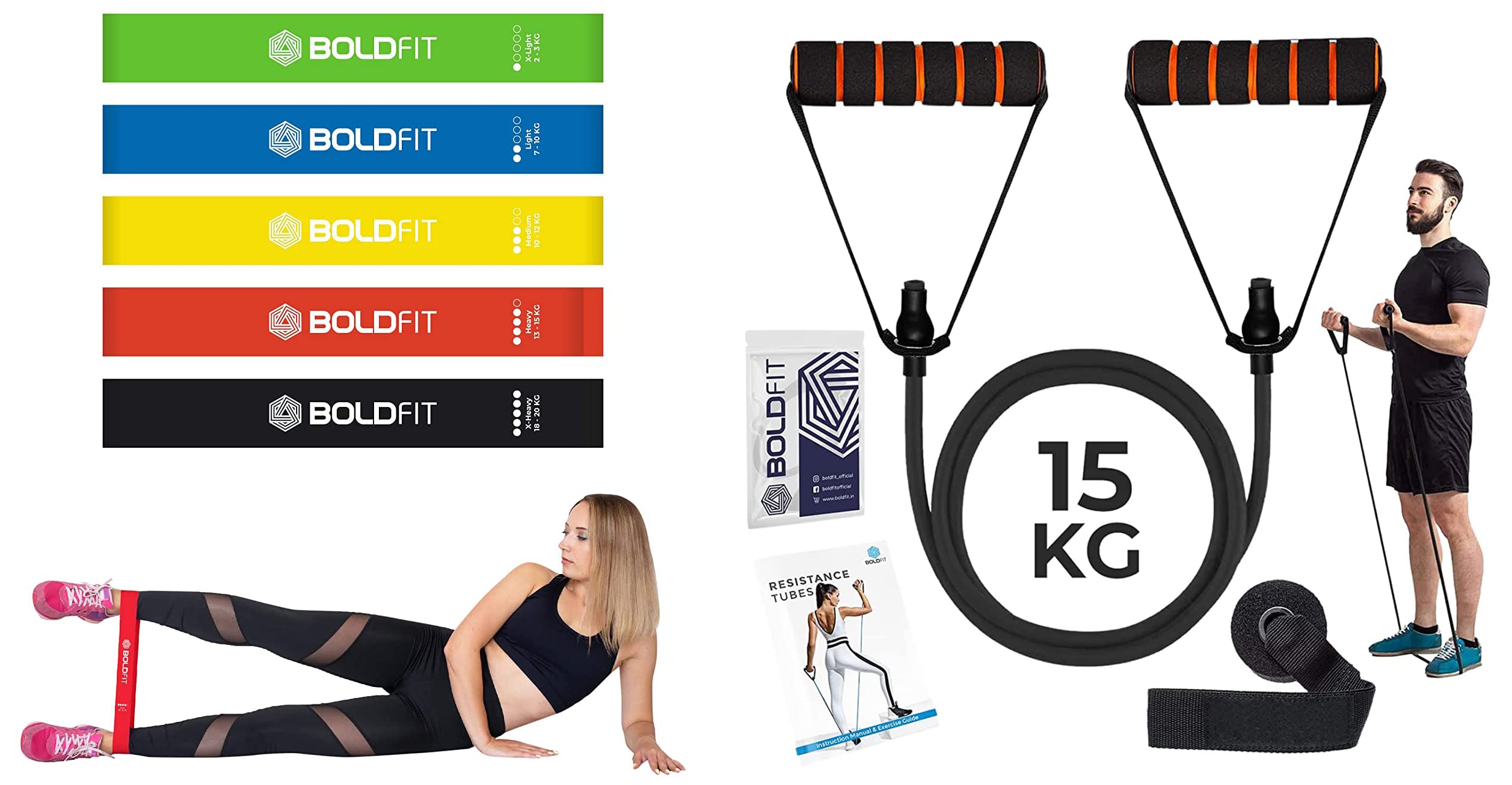 HomeHealth & PersonalSports & fitnessSports EquipmentsBoldfit Mini Loop Bands Resistance Bands Mini Loop (Set of 5) Perfect for Toning & Home Workout (Carry Bag Included) (Multicolor) & Resistance Tube with Foam Handles (Black -15KG)
