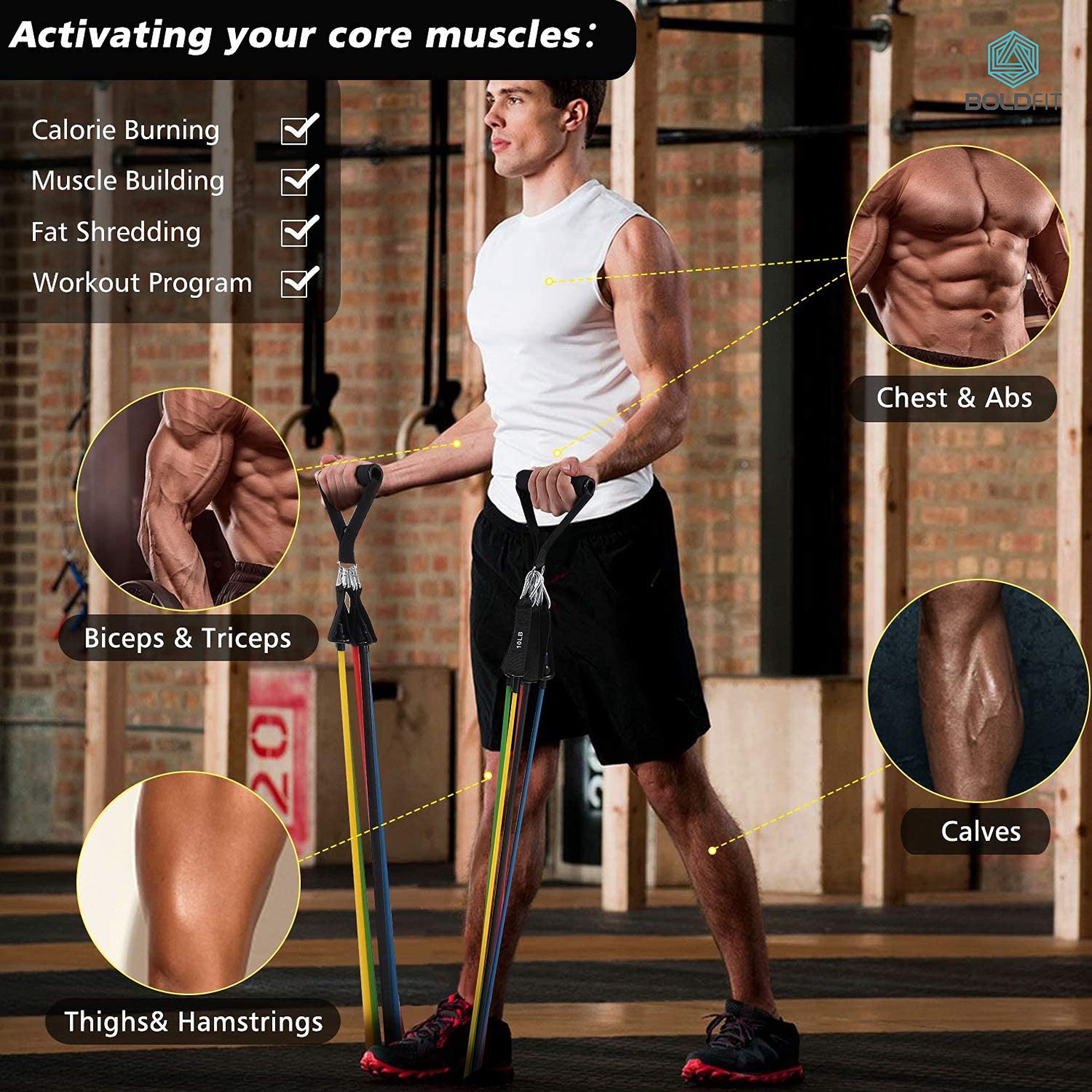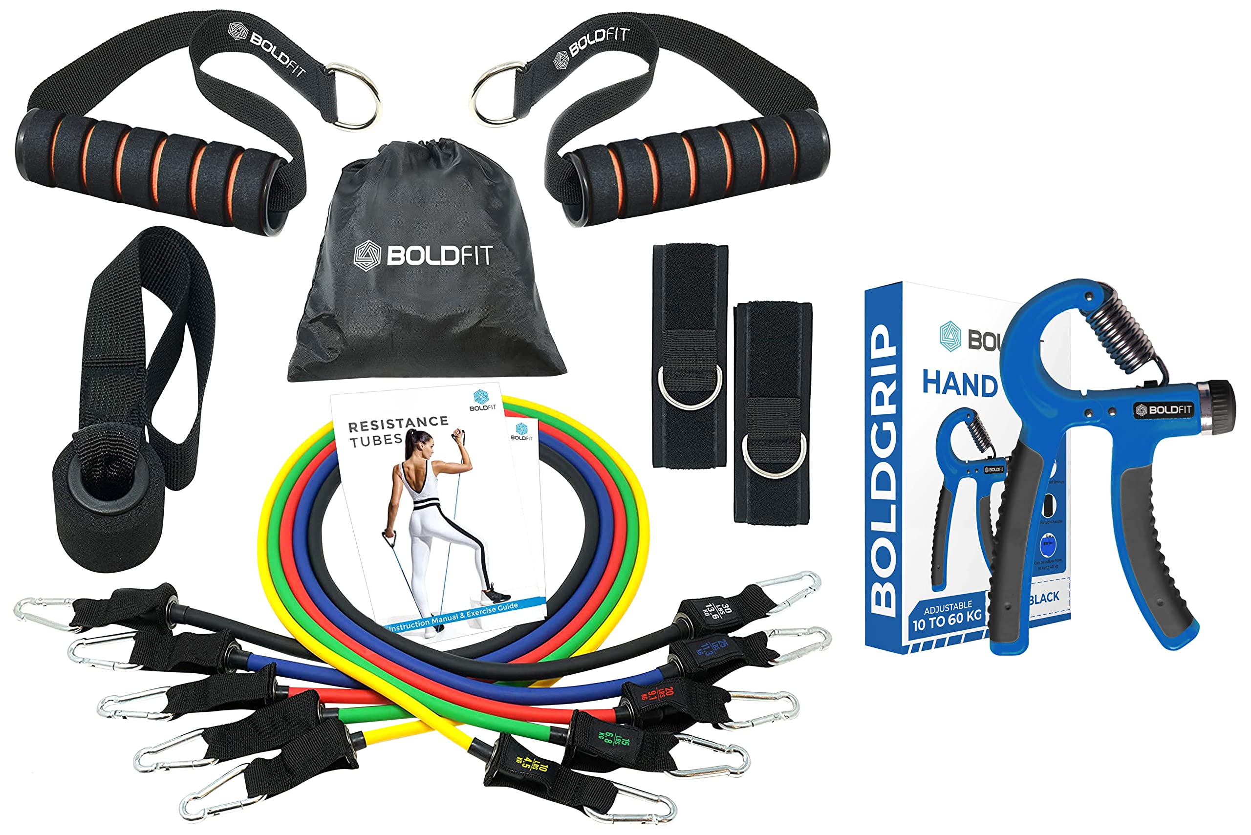 HomeHealth & PersonalSports & fitnessSports EquipmentsBoldfit Resistance Band Set with Handles Portable Toning Tubes with Door Anchor & Foam Handles. (11 Pieces Tube Set) Multicolor L & Hand Grip 10kg to 60kg Adjustable Hand Grip Strengthener (Blue)