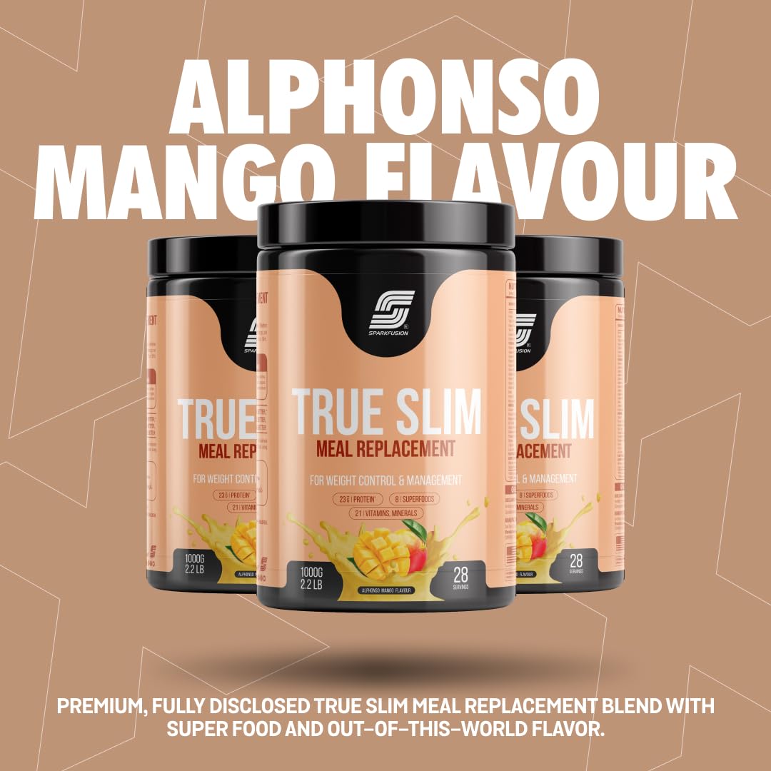 Sparkfusion True Slim Protein Powder Meal Replacement Shake | For Weight Control And Management | 23 gm Protein With 8 Ayurvedic Superfood | Sugar Free | For Men and Women (Alphonso Mango 1000 gm)