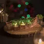 Float away with these incandescent burning votives on a long sail. Bon Voyage!!! Hand Crafted from Iron and coated to give it unique finish and long life. The Wire mesh is given an antique finish by brown Golden t to enhance its look. This piece comes with Three votive (3) with colour choices to suit your home decor. Just light the votive and let your walls glow with the rich colour.