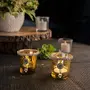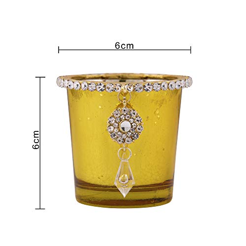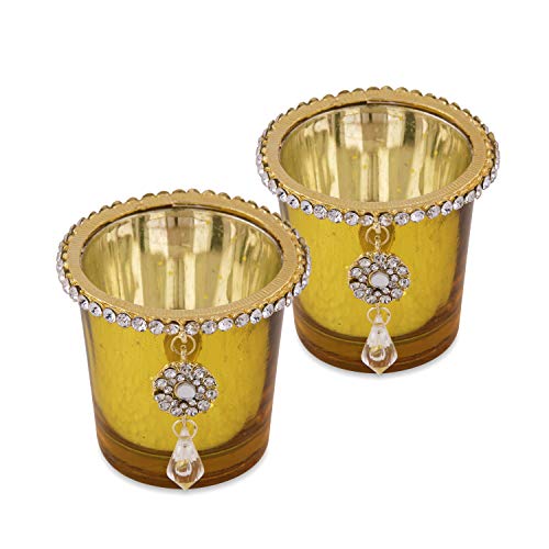 Vintage and beautiful light up this votive in your home and create an aura of mystique and tranquility. Let the candle flames entice you to another world. This exclusive Glass Votive is coated with Silver from inside and ted externally giving it regal touch and feel. In addition decorated with a Gold plated Jewel Ring and Dangler to enhance its beauty and vintage appeal. Simply light a wax Tea-Light inside and enjoy the look.
