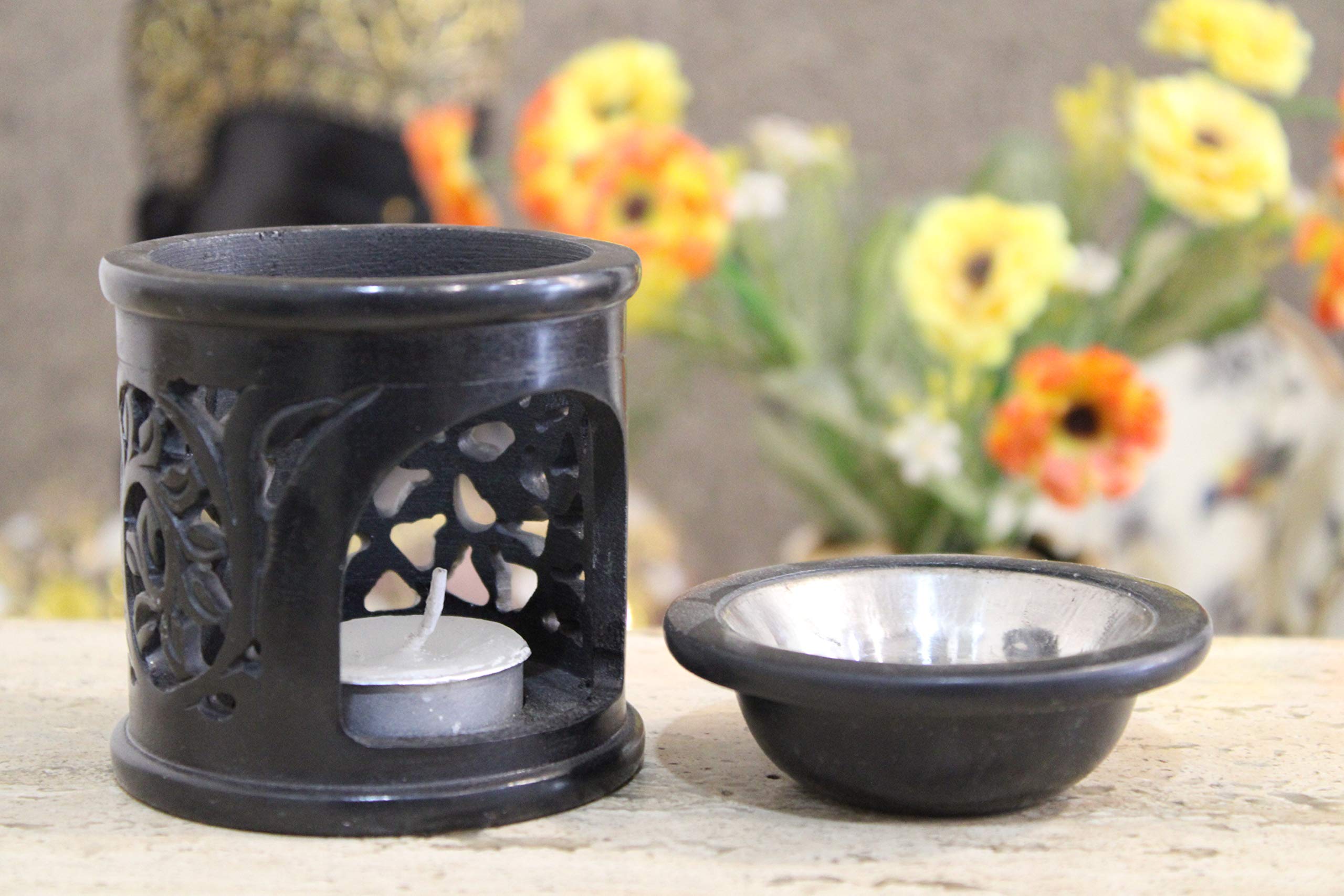 Aromatherapy Artisan Handcarved Stone Oil Diffuser Burner with Tea Light Holder. Hand carved from soapstone by the artisans of rural India. This diffuser is delicately carved from Soapstone. Unique with a natural variation in color of the stone Our artisans work tirelessly to bring to you perfectly carved pieces. All our products are sourced from traditional artisans from Indian villages who have been using time tested techniques in the handcrafting and this is our small effort to provide some highly needed support to these traditional arts and crafts that are facing a daily struggle to survive in todays world.