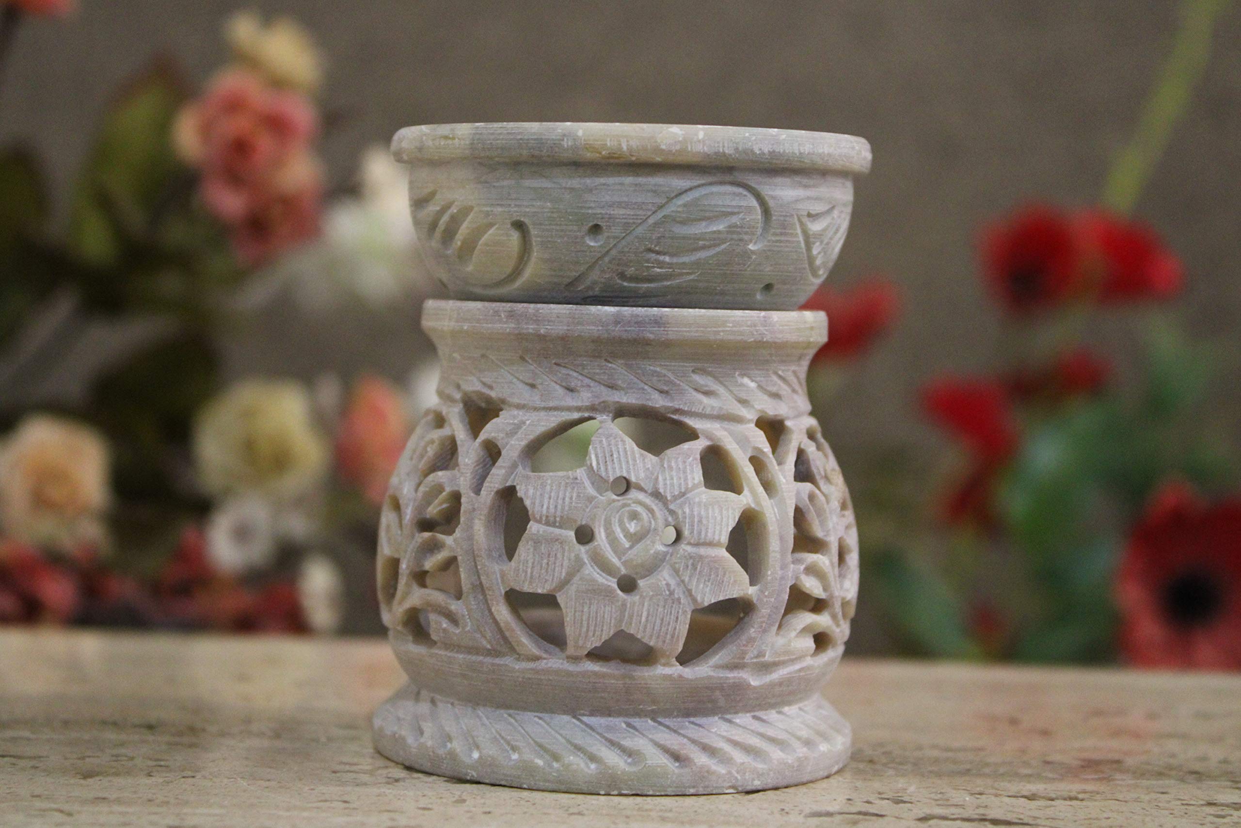 MARBLE INLAY ART AGRA - PACCHIKARI Handcrafted Marble Soapstone Floral Carving Candle Aroma Burner Oil Diffuser Tea Light Holder Oil Warmer with 1 Free Tea Light Candle.