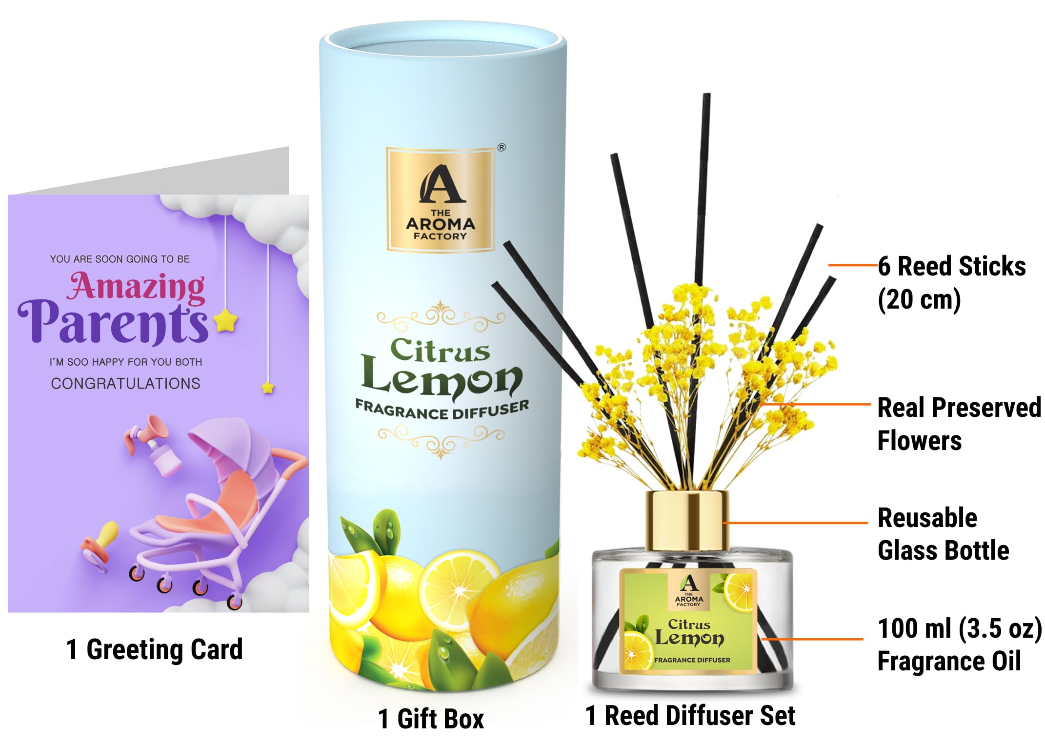 Pregnant expecting couple to be parents Gift with Card hamper gifts best unique for greeting message customised customized personalised personalized candy toffee fragrance scent perfumeThe Aroma Factory Reed Diffusers are perfect gift for friends family. Fresh Fragrance curated by Scented oil essential Perfumers to add magic aromas to your senses. Made using natural essential oils in alcohol free aromatic fragrance base. celebration with greeeting happy cards. Hamper fibre fiber rattan reeds. Refill & Reuse they last upto 60 days based on usage/air at home office spa. Try Our Range : Rose Lavender Lemongrass Citrus Lemon Fresh Active White Sage.The Aroma Factory Pregnant expecting couple / to be parents Gift with Card Citrus Lemon Fragrance Reed Diffuser Set (1 box + 1 card)