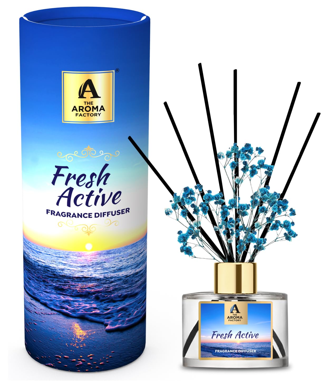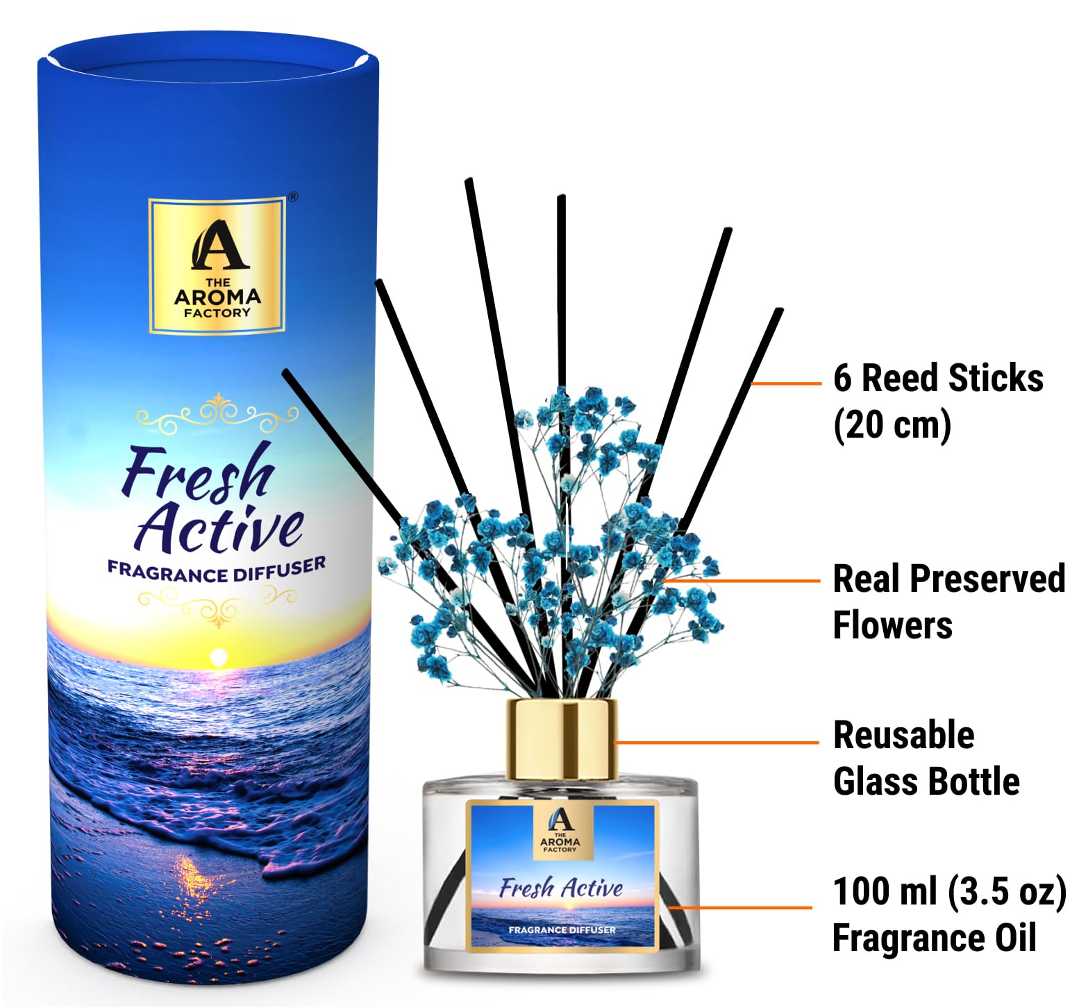 The Aroma Factory Fragrance Diffuser Set with Fibre Reed Sticks Real Flowers 100 ml (3.4 Oz) Aroma Oil (Fresh Active 1 Box)