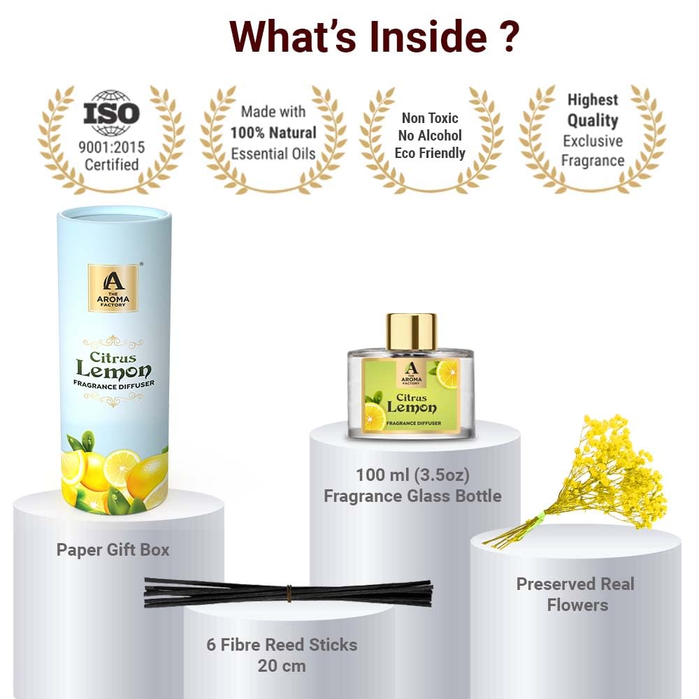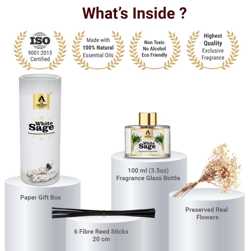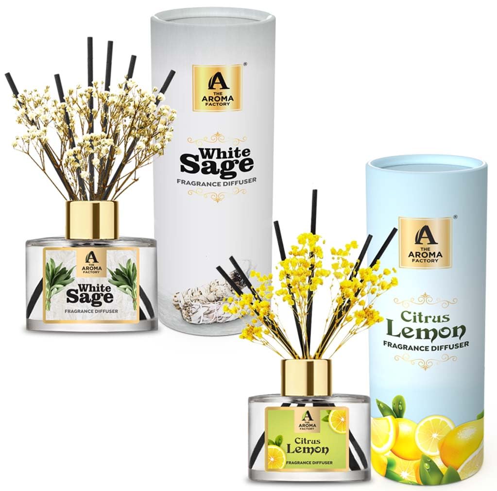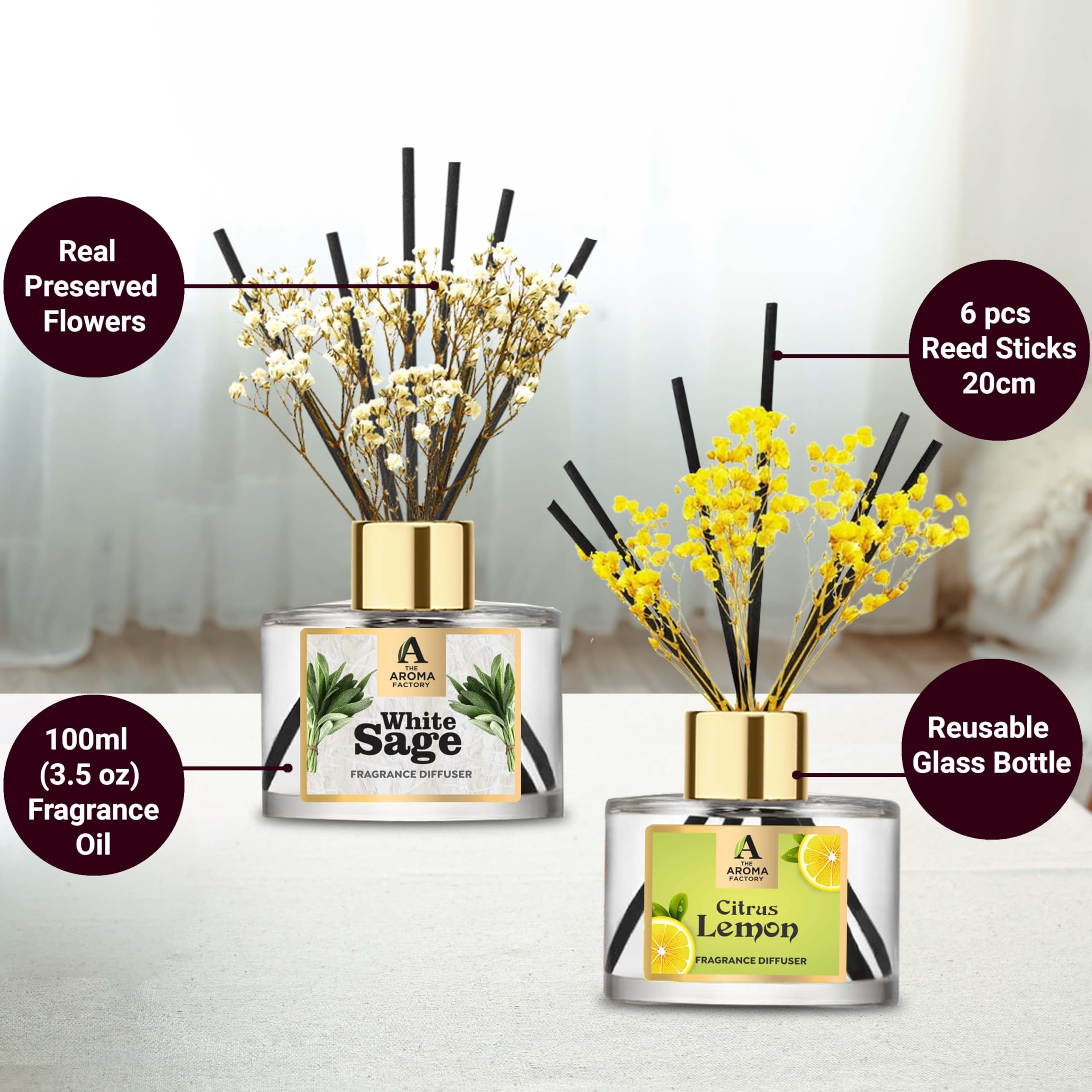 The Aroma Factory Fragrance Diffuser Set with Fibre Reed Sticks Real Flowers 100 ml (3.4 Oz) Aroma Oil (White Sage & Citrus Lemon 2 Box)