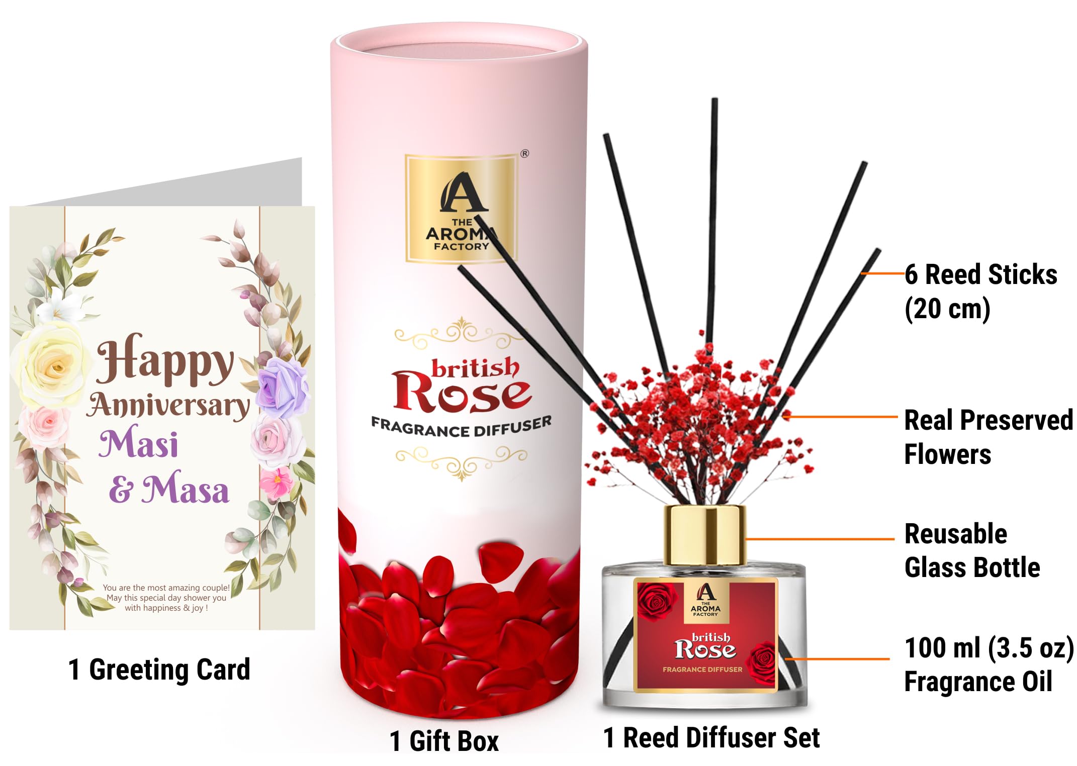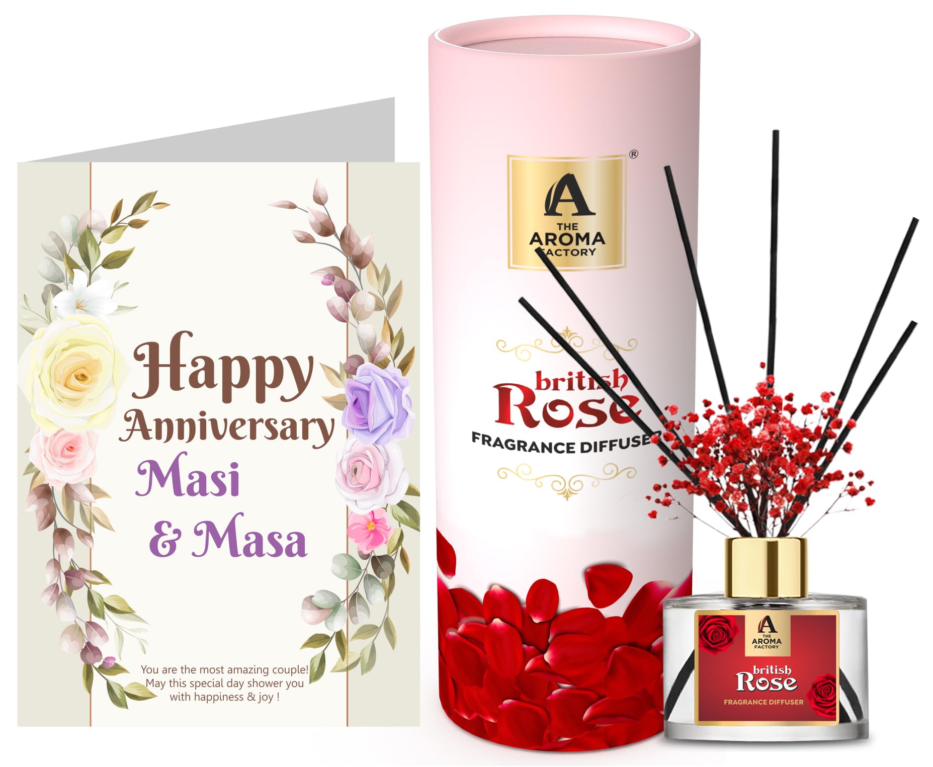 Happy Anniversary Masi Mousi & Masaji Mosa Gift with Card hamper gifts best unique for greeting message customised customized personalised personalized candy toffee fragrance scent perfumeThe Aroma Factory Reed Diffusers are perfect gift for friends family. Fresh Fragrance curated by Scented oil essential Perfumers to add magic aromas to your senses. Made using natural essential oils in alcohol free aromatic fragrance base. celebration with greeeting happy cards. Hamper fibre fiber rattan reeds. Refill & Reuse they last upto 60 days based on usage/air at home office spa. Try Our Range : Rose Lavender Lemongrass Citrus Lemon Fresh Active White Sage.The Aroma Factory Happy Anniversary Masi / Mousi & Masaji / Mosa Gift with Card British Rose Fragrance Reed Diffuser Set (1 box + 1 card)