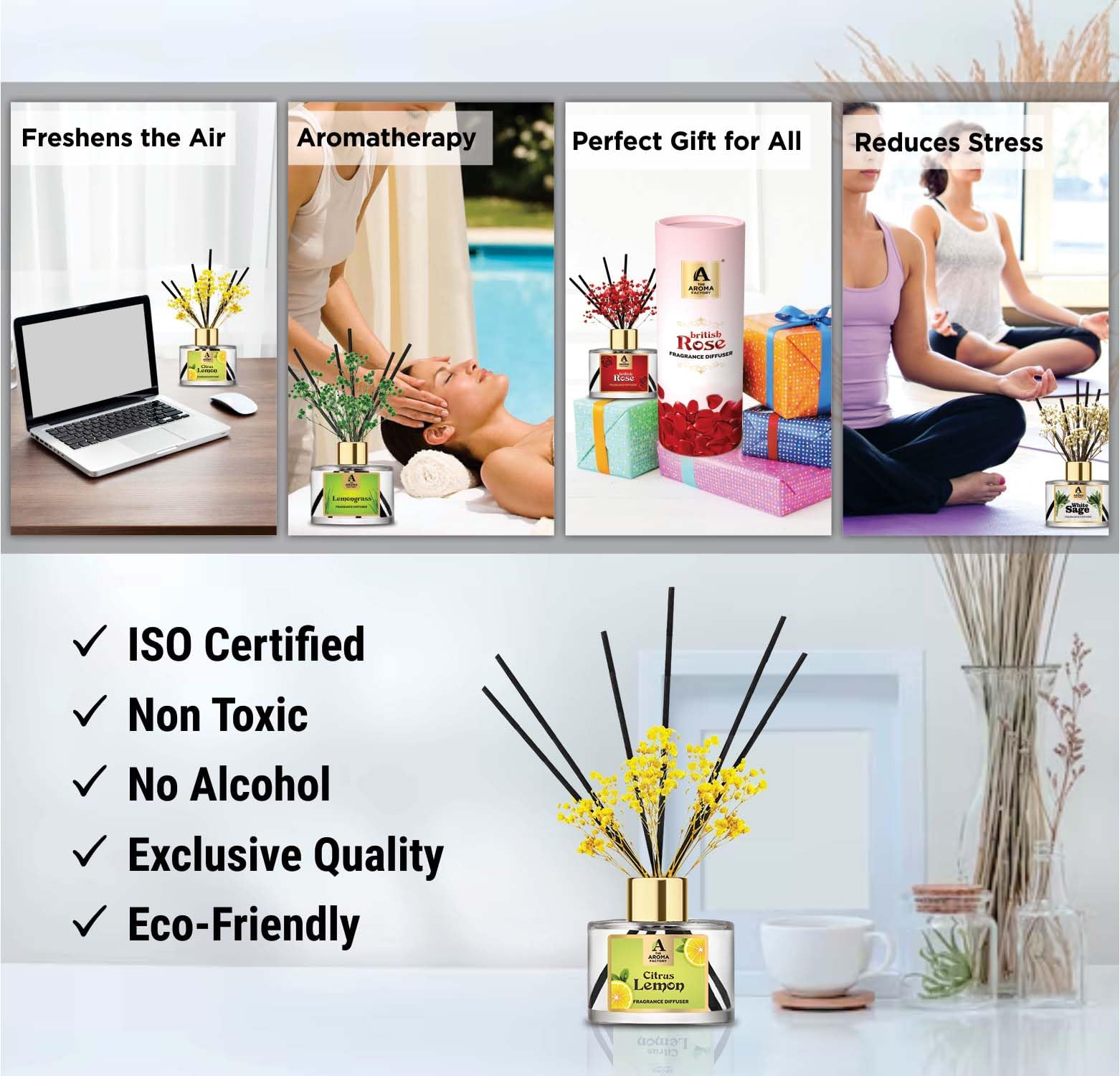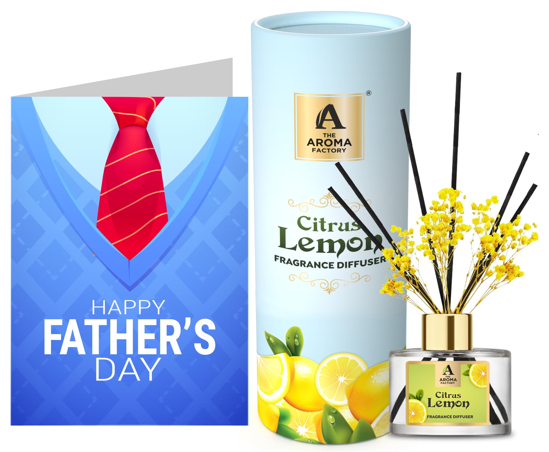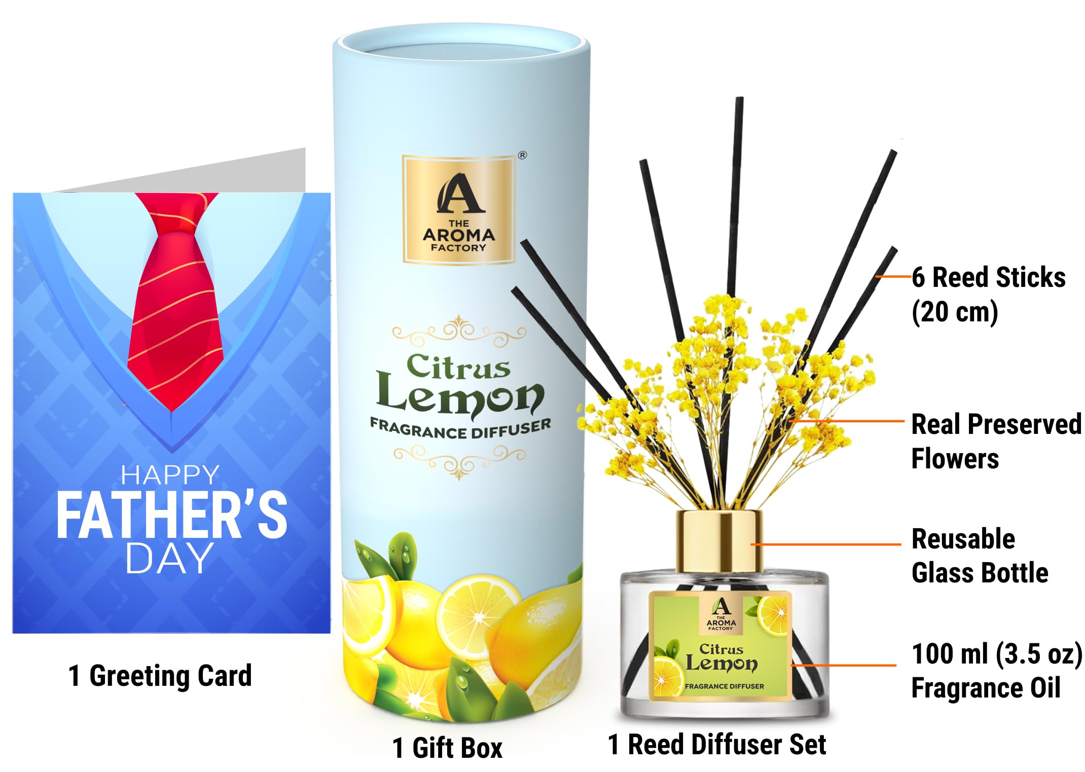 The Aroma Factory Happy Fathers Day Greeting Card & Fragrance Reed Diffuser Gift Set Citrus Lemon(1 box + 1 Card) The Aroma Factory Reed Diffusers are perfect gift for friends family. Fresh Fragrance curated by Scented oil essential Perfumers to add magic aromas to your senses. Made using natural essential oils in alcohol free aromatic fragrance base. celebration with greeeting happy cards. Hamper fibre fiber rattan reeds. Refill & Reuse they last upto 60 days based on usage/air at home office spa. Try Our Range : Rose Lavender Lemongrass Citrus Lemon Fresh Active White Sage. The Aroma Factory Eid Mubarak Greeting Greeting Card & Fragrance Reed Diffuser Gift Set British Rose (1 box + 1 Card)
