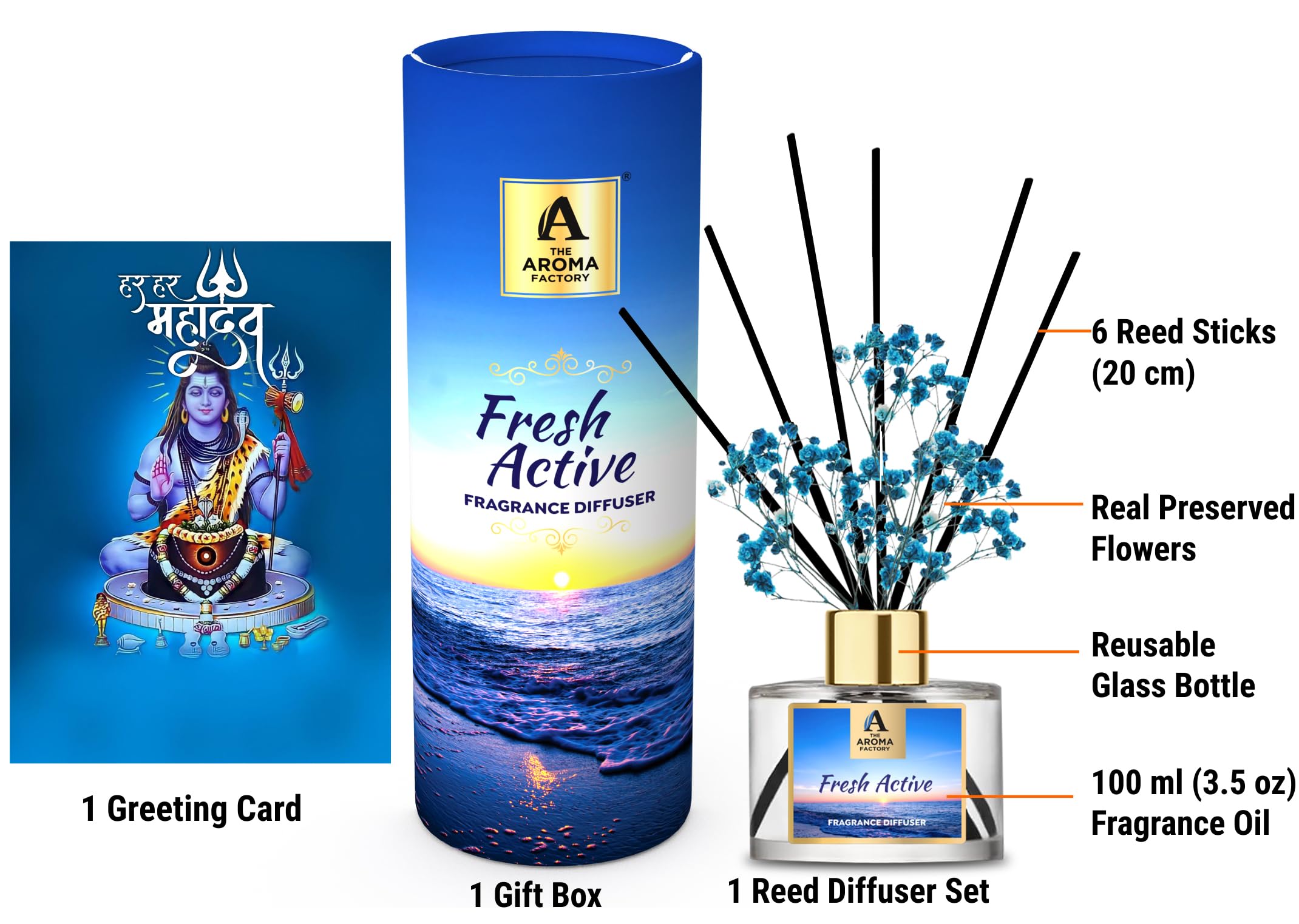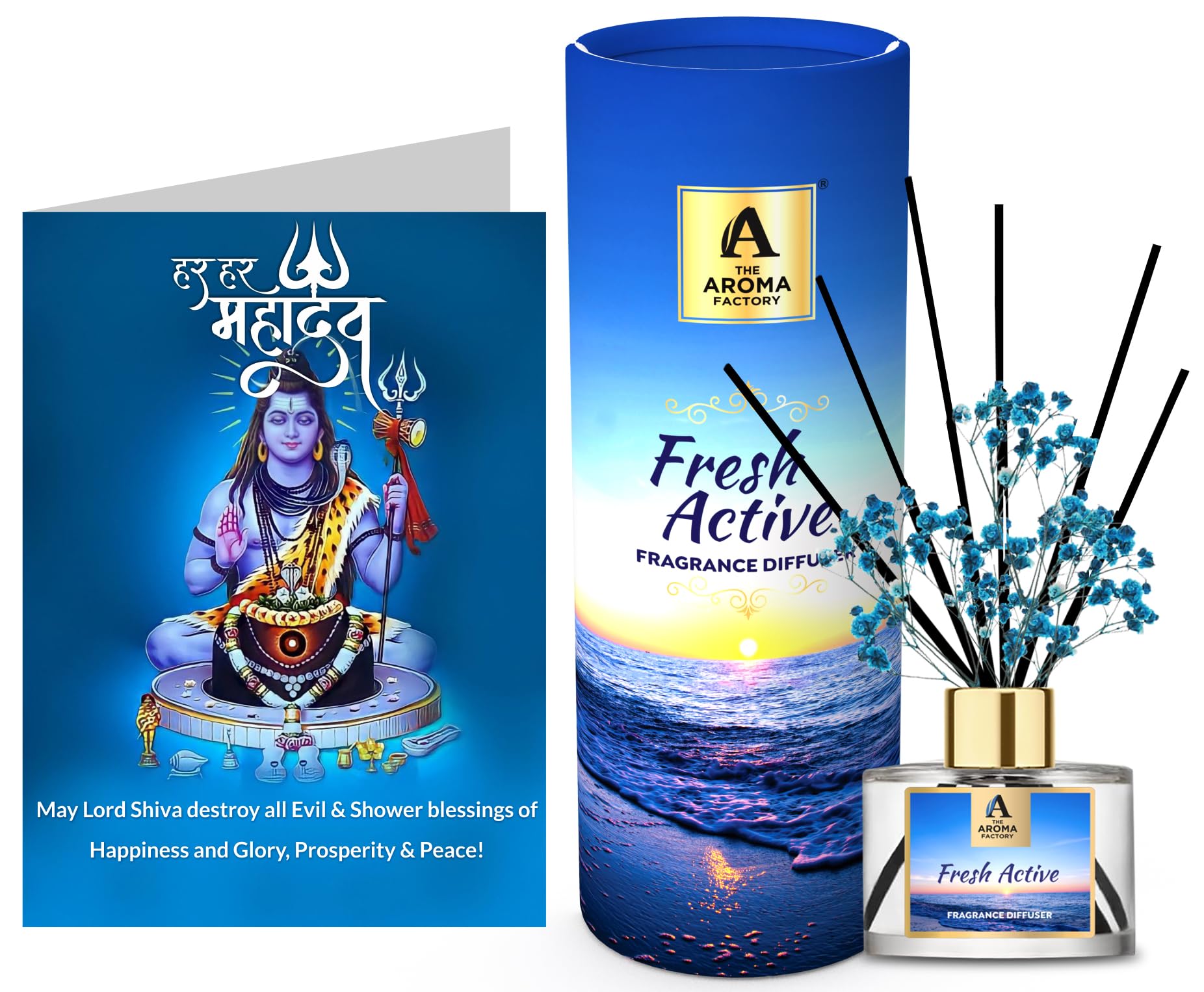 The Aroma Factory Shivratri Greeting Card & Fragrance Reed Diffuser Gift SetFresh Active (1 box + 1 Card) The Aroma Factory Reed Diffusers are perfect gift for friends family. Fresh Fragrance curated by Scented oil essential Perfumers to add magic aromas to your senses. Made using natural essential oils in alcohol free aromatic fragrance base. celebration with greeeting happy cards. Hamper fibre fiber rattan reeds. Refill & Reuse they last upto 60 days based on usage/air at home office spa. Try Our Range : Rose Lavender Lemongrass Citrus Lemon Fresh Active White Sage. The Aroma Factory Eid Mubarak Greeting Greeting Card & Fragrance Reed Diffuser Gift Set British Rose (1 box + 1 Card)