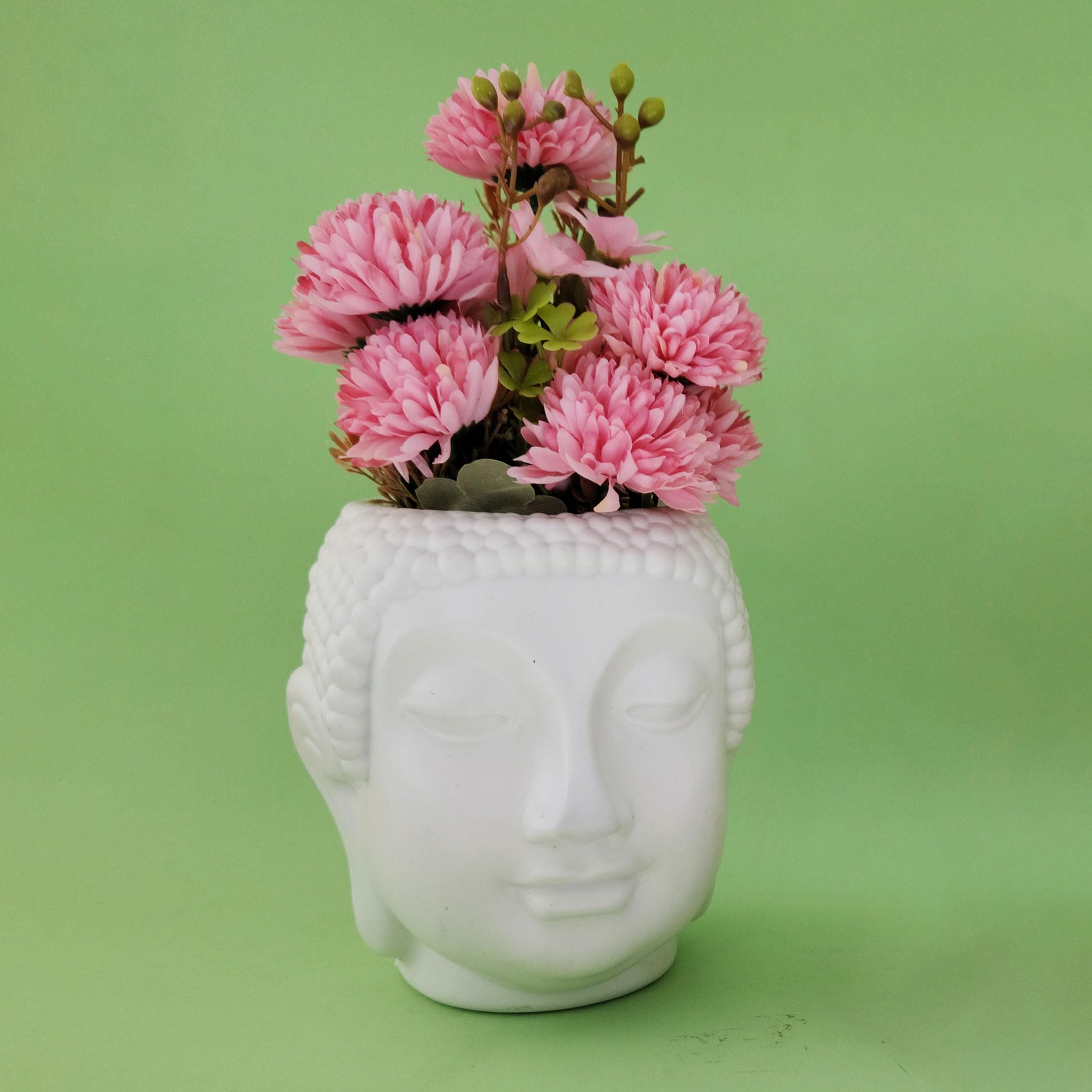 Embrace the serenity and beauty of the Buddha Face Flower Pot Vase and add a touch of tranquility to your home or office space. The Buddha Face Flower Pot Vase is ideally suited for artificial flowers allowing you to create a captivating display without the need for constant maintenance. It provides the perfect backdrop for showcasing your favorite silk or faux floral arrangements adding a touch of natural beauty to any room. Whether you place it on a mantel coffee table or as a centerpiece on your dining table the Buddha Face Flower Pot Vase will undoubtedly become a conversation starter. Its timeless design and spiritual symbolism make it an ideal gift for those seeking peace and harmony in their lives.