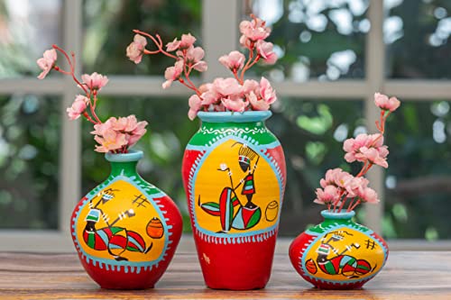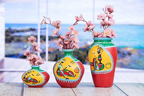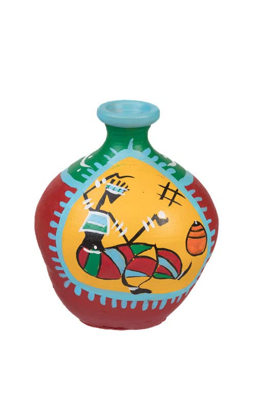 Karru Krafft Skillfull artisan created in terracotta and hand-ted with excellent details by skilled and semi-skilled individuwith a respect for art and craft using India's native resources methods and technology that also functions as an ethnic table top adornment. The flower vase has been hand-ted in a circular patch with an indigenous Indian traditional artwork. The small size and uncomplicated functionality are suitable for living room / child's room/bed room/balcony garden decoration Shelf Decoration and Ideal for Gifing making them appear more domestic and bringing joy into your home.