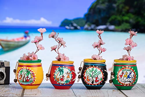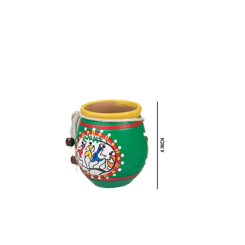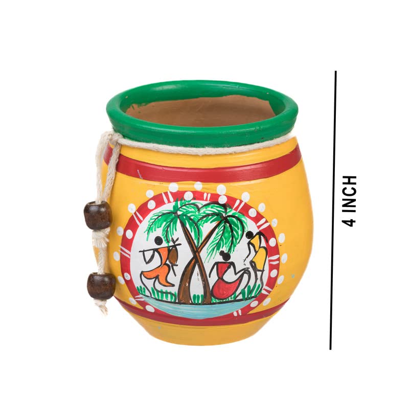 Karru Krafft Skillfull artisan created in terracotta and hand-ted with excellent details by skilled and semi-skilled individuwith a respect for art and craft using India's native resources methods and technology that also functions as an ethnic table top adornment. The flower vase has been hand-ted in a circular patch with an indigenous Indian traditional artwork. The small size and uncomplicated functionality are suitable for living room / child's room/bed room/balcony garden decoration Shelf Decoration and Ideal for Gifing making them appear more domestic and bringing joy into your home.