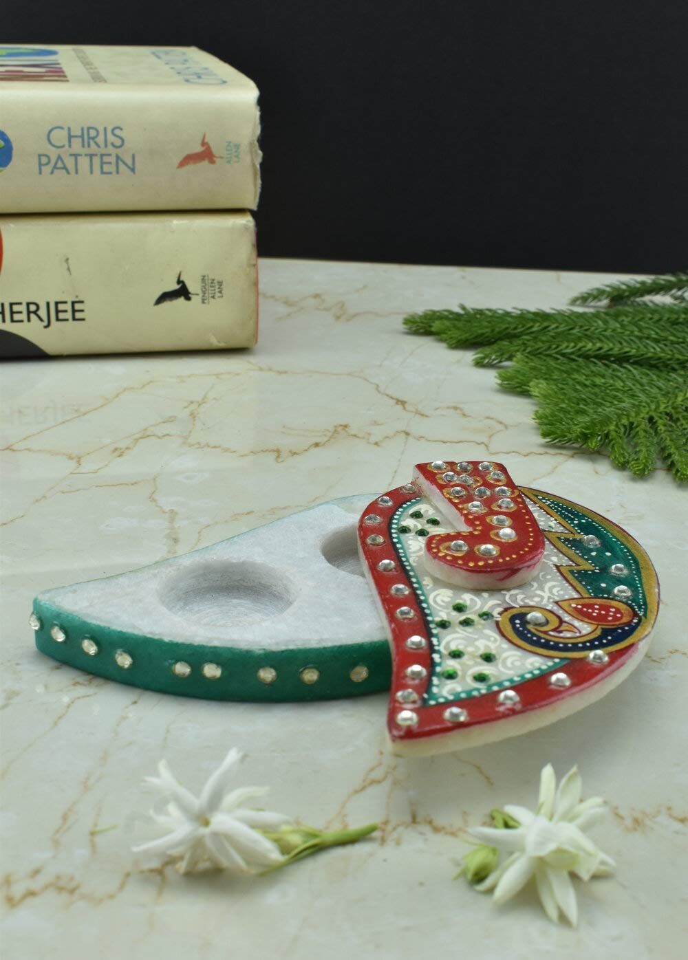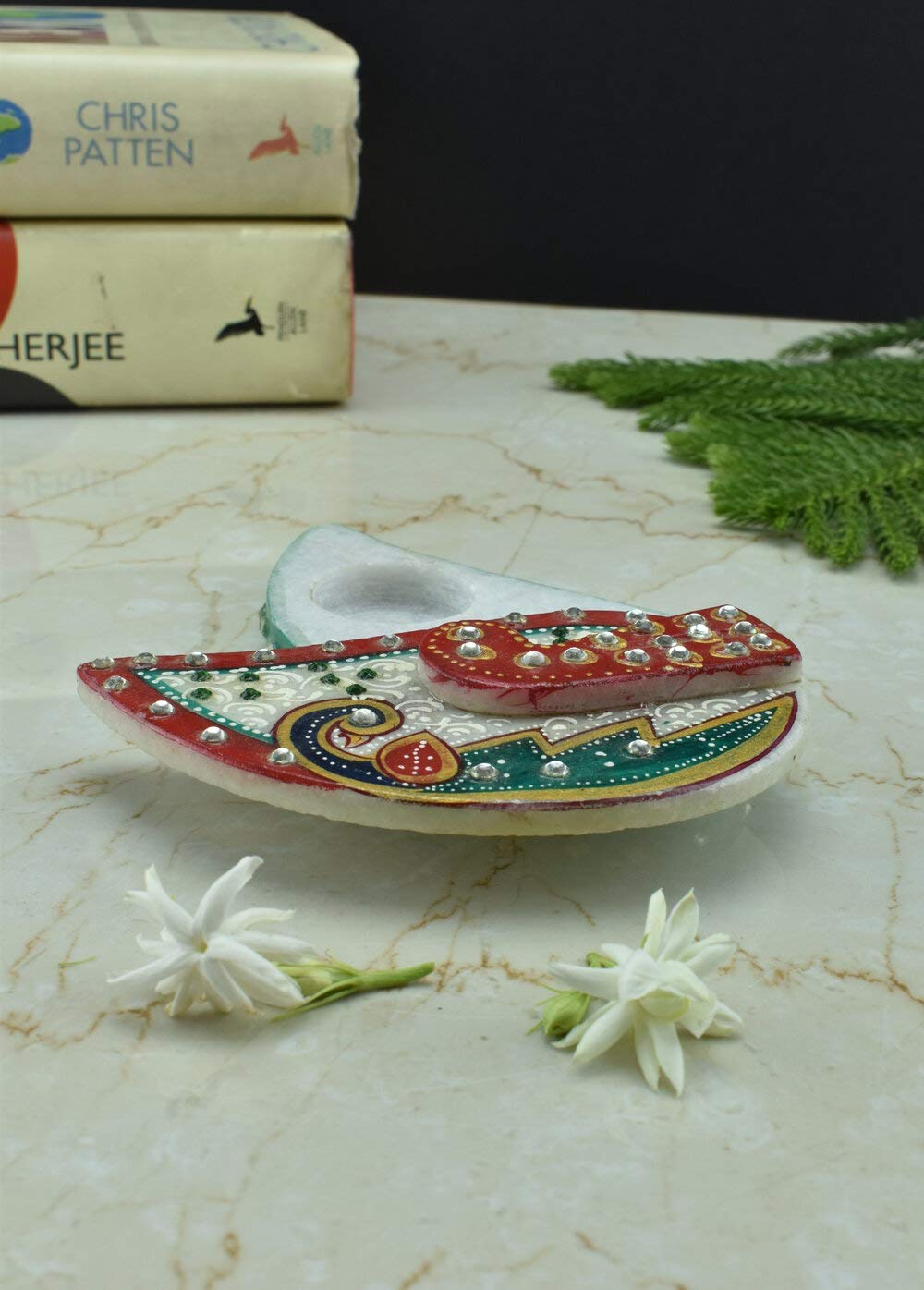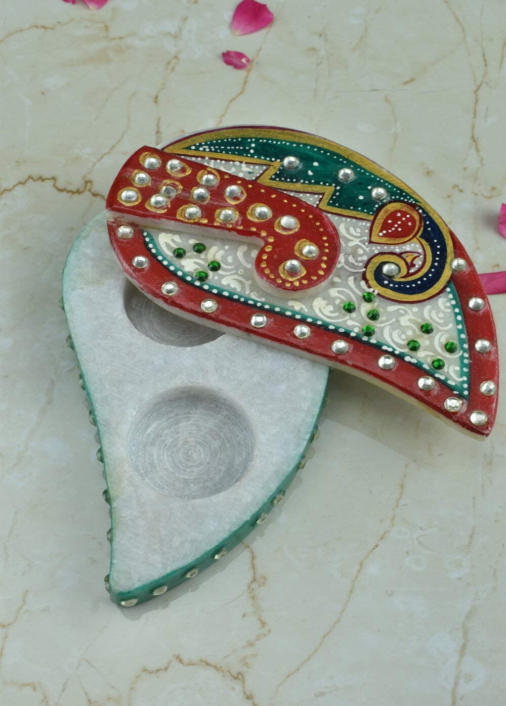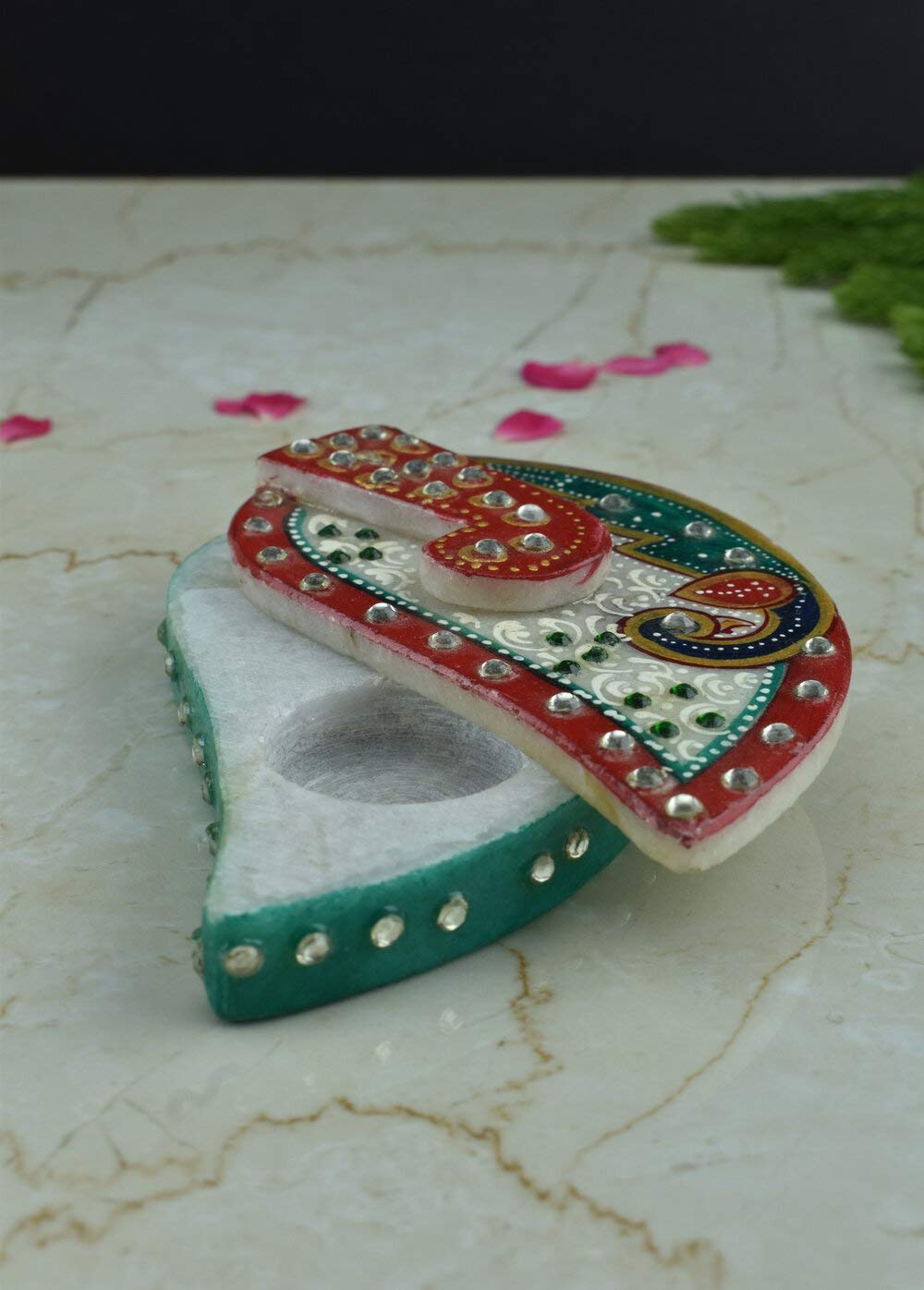 Roli Tika Chawal Chopra . Artifact is jewelled with Meenakari and Kundan work. A masterpiece in marble Adorned with subtle stokes add brilliance to your home and office decor. size - 5 inches. A perfect gift for any occasion. These marvelous handcrafted artifacts from Rajasthan carved out from the best marble of India are the distinguished piece of art to enhance the beauty of your interiors. The marble artifact is will look great and stunning in the temple and holy occasions.