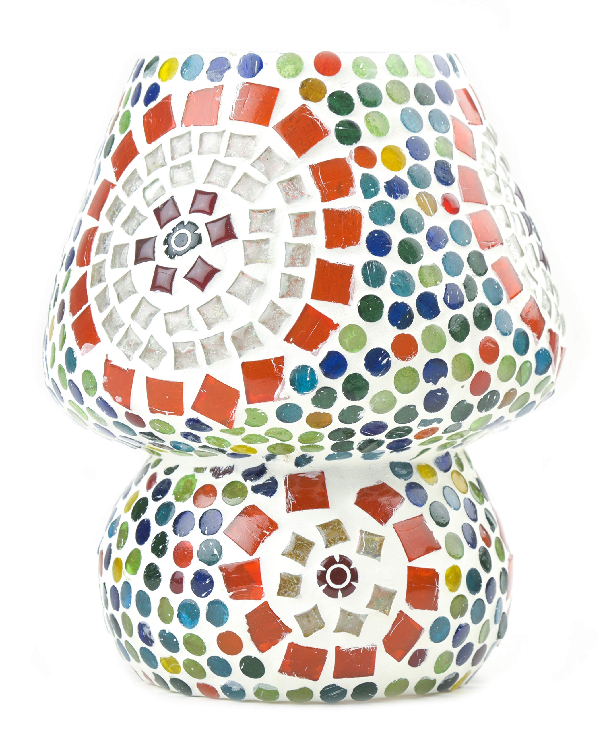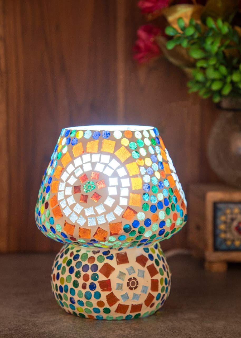 About the product: the lovely mosaic style table lamp casts a cool glow in your room. The unique lamp features a beautifully colored glass mosaic shade and base. Requires a 25w-100w bulb (not incl. ) 2 Meter power cord has on/off switch. Glass. Approx. 6"Dia. X 7"h. Material type: glasswe strive to provide a positive shopping experience by meeting or exceeding your expectations. About we're the pioneer seller of occasion gifting and conceptual home decor (rapidly expanding in india and internationally). As a business we are creative innovative and forward-thinking. As a team we are supportive passionate and absolute experts in what we do. Selection we offer continues to be core to our business and our commitment to impeccable craftsmanship is reflected in all we do.This dome shaped table glass lamp has colourful glass crystal all over its body. Beautiful small and big flowers along with these crystal glass increases its beauty. This lamp increases appeal to its surrounding when powered by artificial yellow or white light.