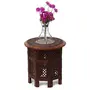 Wooden carved foldable table with fine carving & brass inlay work. Fully handcrafted table can be used for keeping flower vases or other decor pieces. Also one can fold the table when not in use. Wooden carved foldable table is made from high quality sheesham wood with high finishing.Color :Brown Material : Wood Size : LXBXH- 12 inch 12 inch 12 inch Care Instruction : Clean with a dry cloth "
