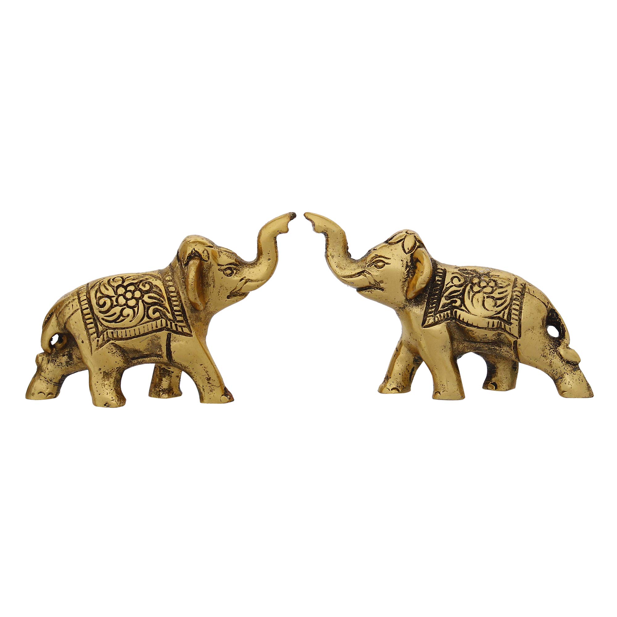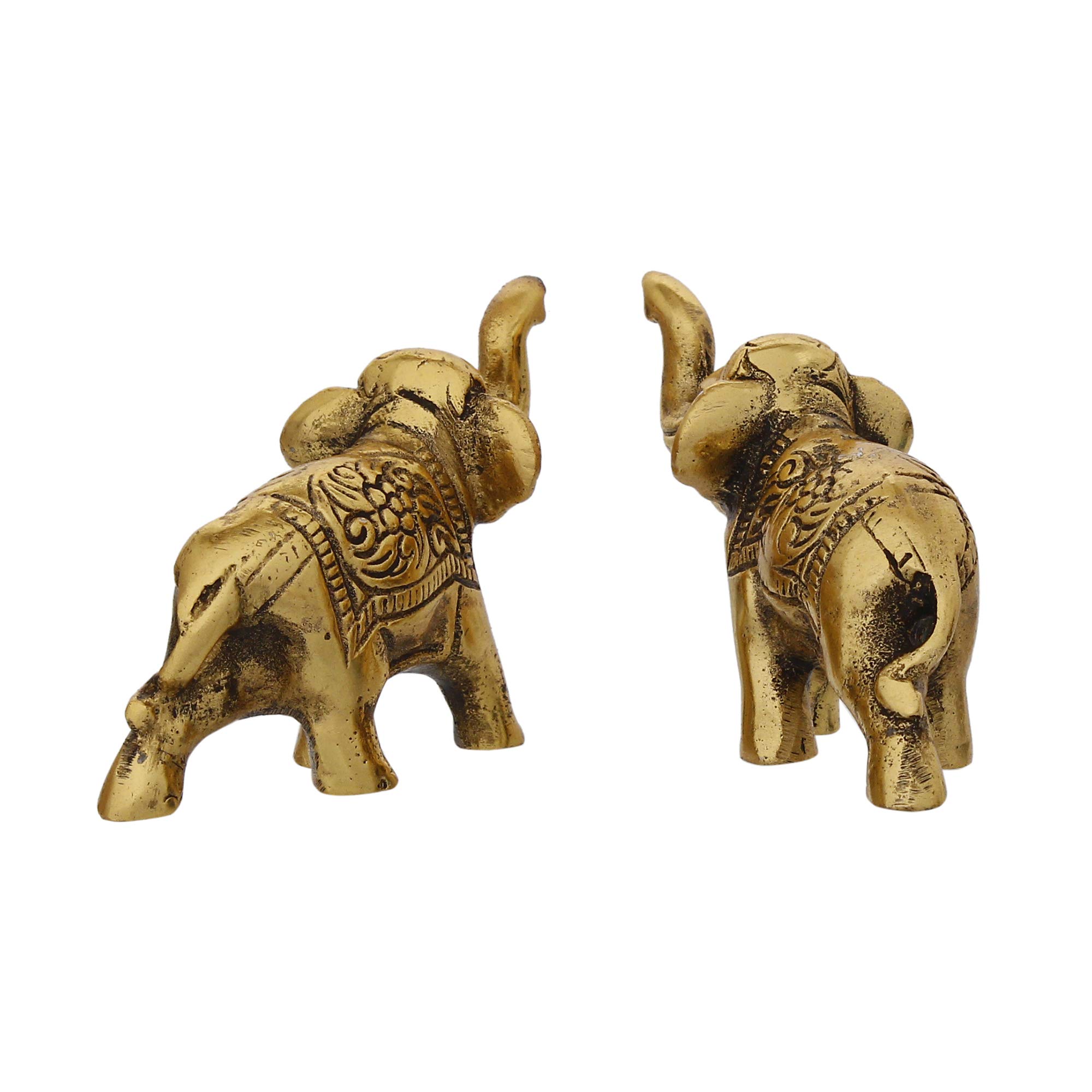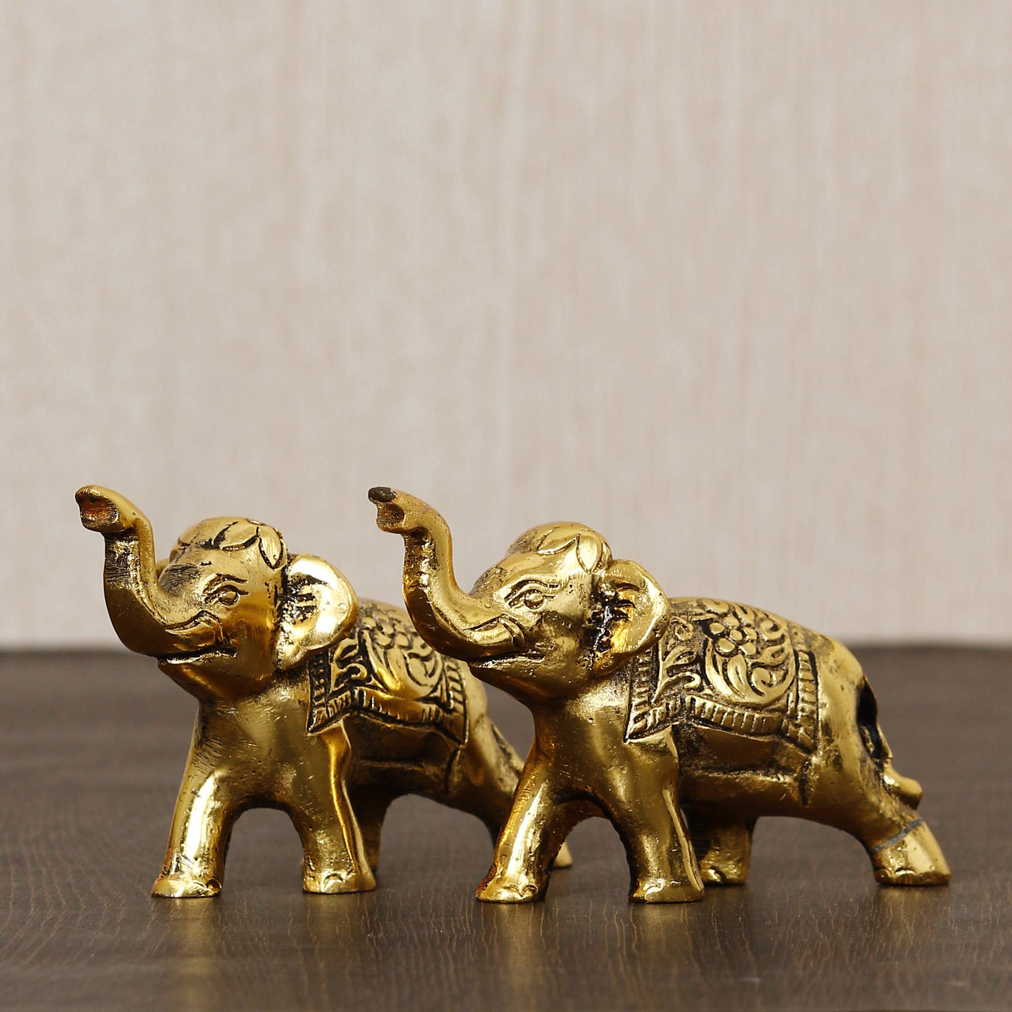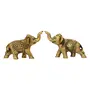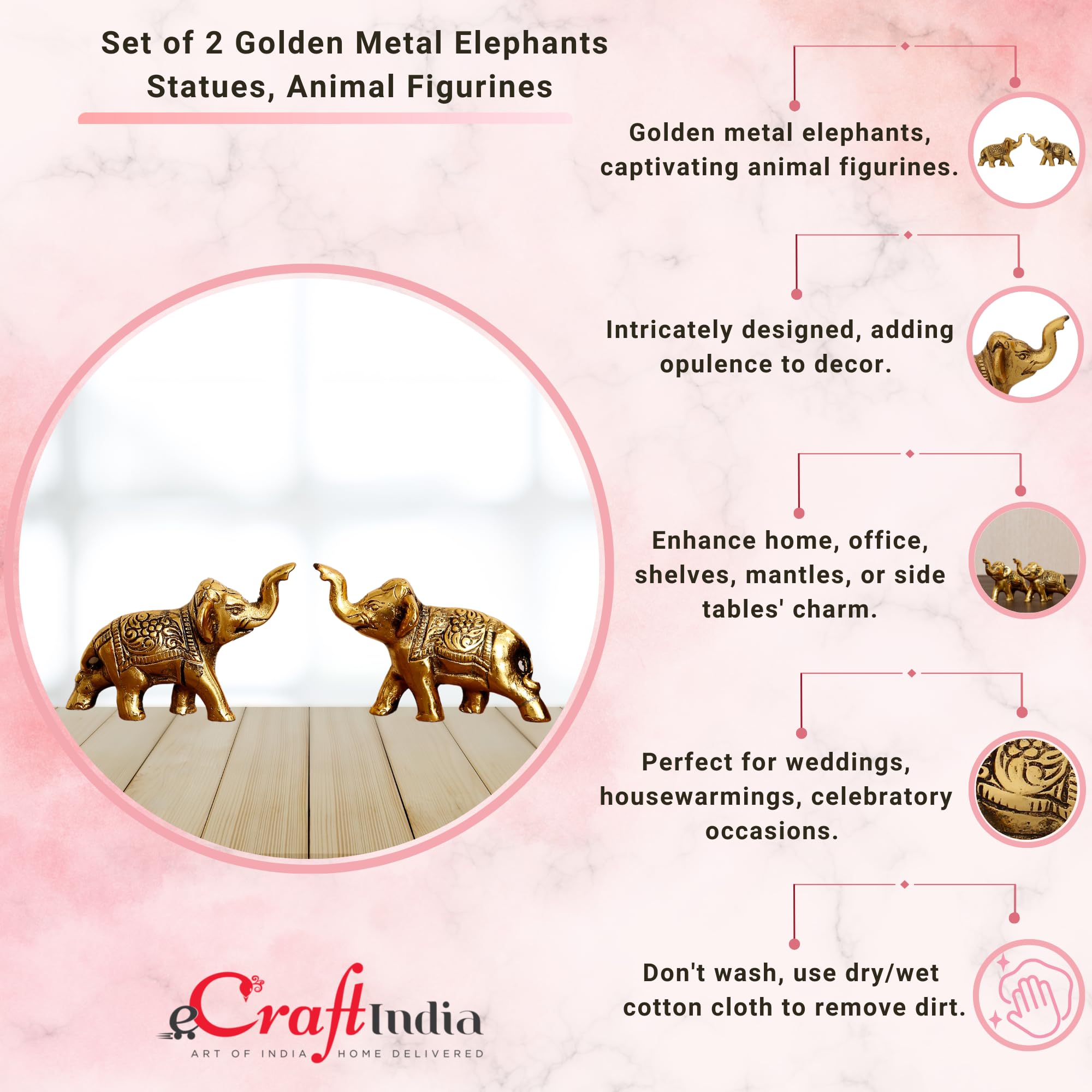 Elevate the look of your home decor with our stunning Set of 2 Golden Metal Elephants Statues! These Animal Figurines and Decorative Showpieces are handcrafted by skilled artisans at eCraftIndia business with love and care. Made from high-quality metal these elephant Sculptures are an ideal table decor item that is sure to add a touch of sophistication and class to your living room. Add a touch of exotic elegance to your interior space with our Set of 2 Golden Metal Elephants Statues! These exquisite Animal Figurines Home Decor pieces are made with premium quality metal and crafted by skilled artisans at eCraftIndia business. Whether used as a decorative item or as a statement piece these Animal Statues are sure to grab everyone's attention with their intricate details and mesmerizing golden finish.