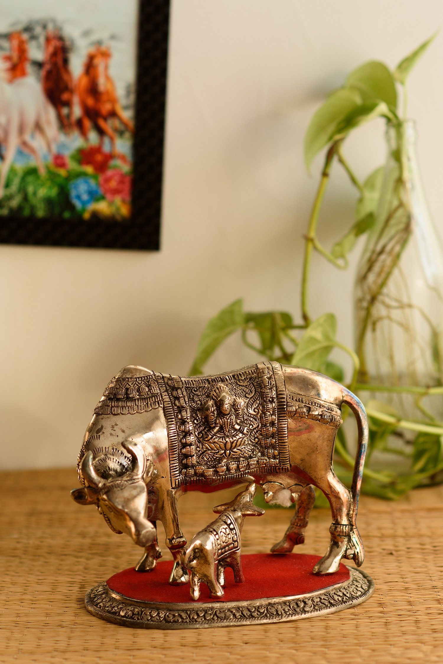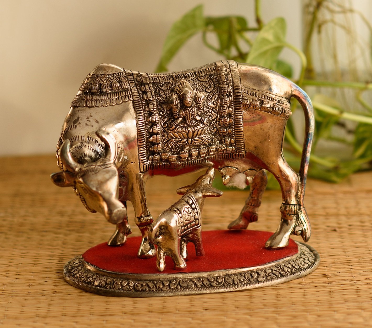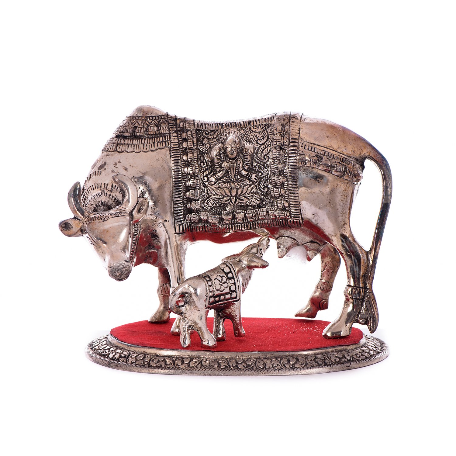 Beautiful creation of kamdhenu cow and calf is a perfect symbol of the undying aura of the holy saint that encompasses numerous devotees round the globe. This statue aptly conveys the emotions of people who consider cow (gomatha) as a motherly figure. Kamdhenu cow and calf statues are widely used for decoration purposes in homes and offices. It serves as a great gift especially around religious celebrations and festivities. This white metal handicraft has been made by skilled artisans from the house of JAIPUR STONE WORK using various traditional techniques.