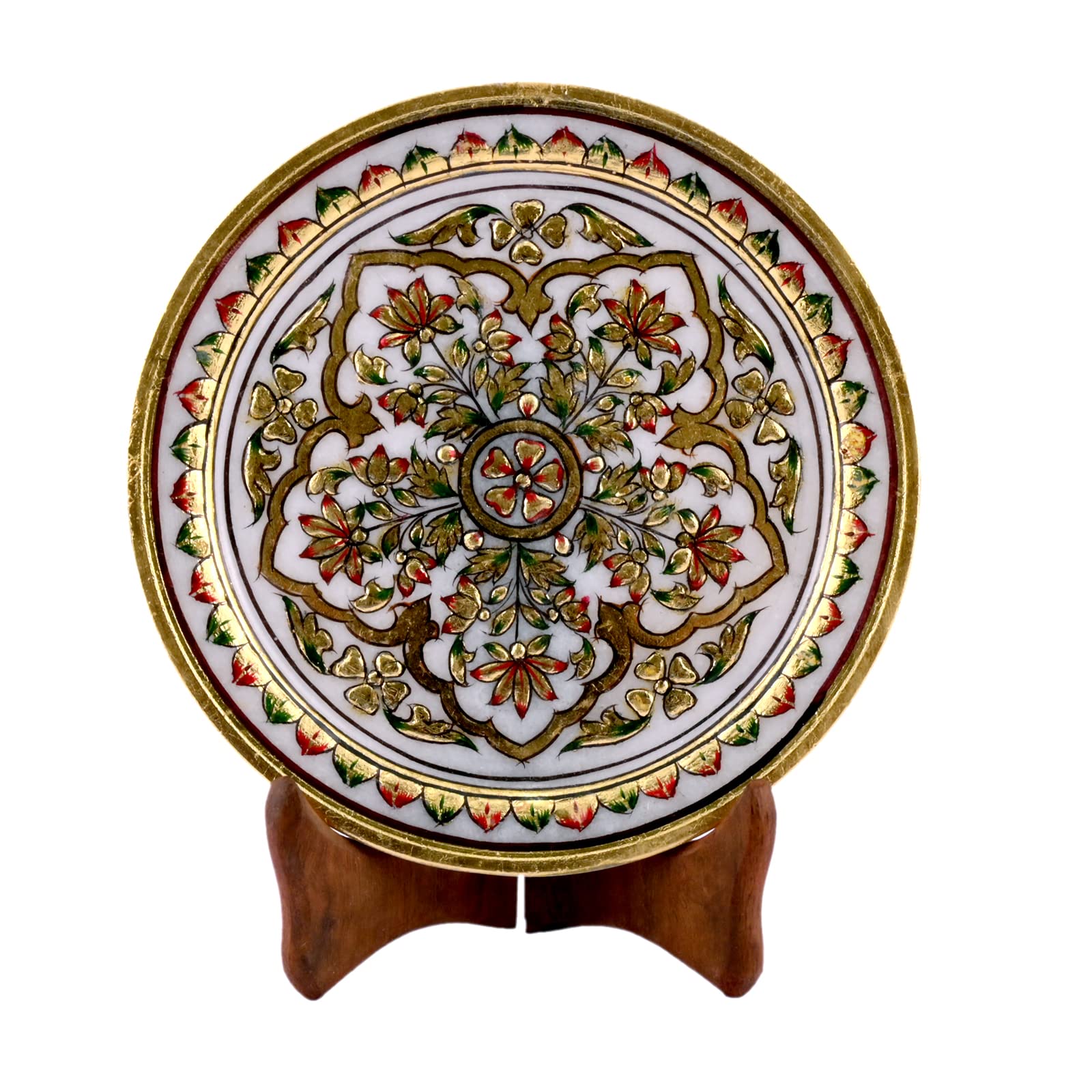 MEENAKARI ENAMEL PRODUCTS 22 Carat Gold Foil Work Round Shape Marble Showpiece Plate with Stand (14.5 cm x 1.5 cm x 14.5 cm) - 5 Star