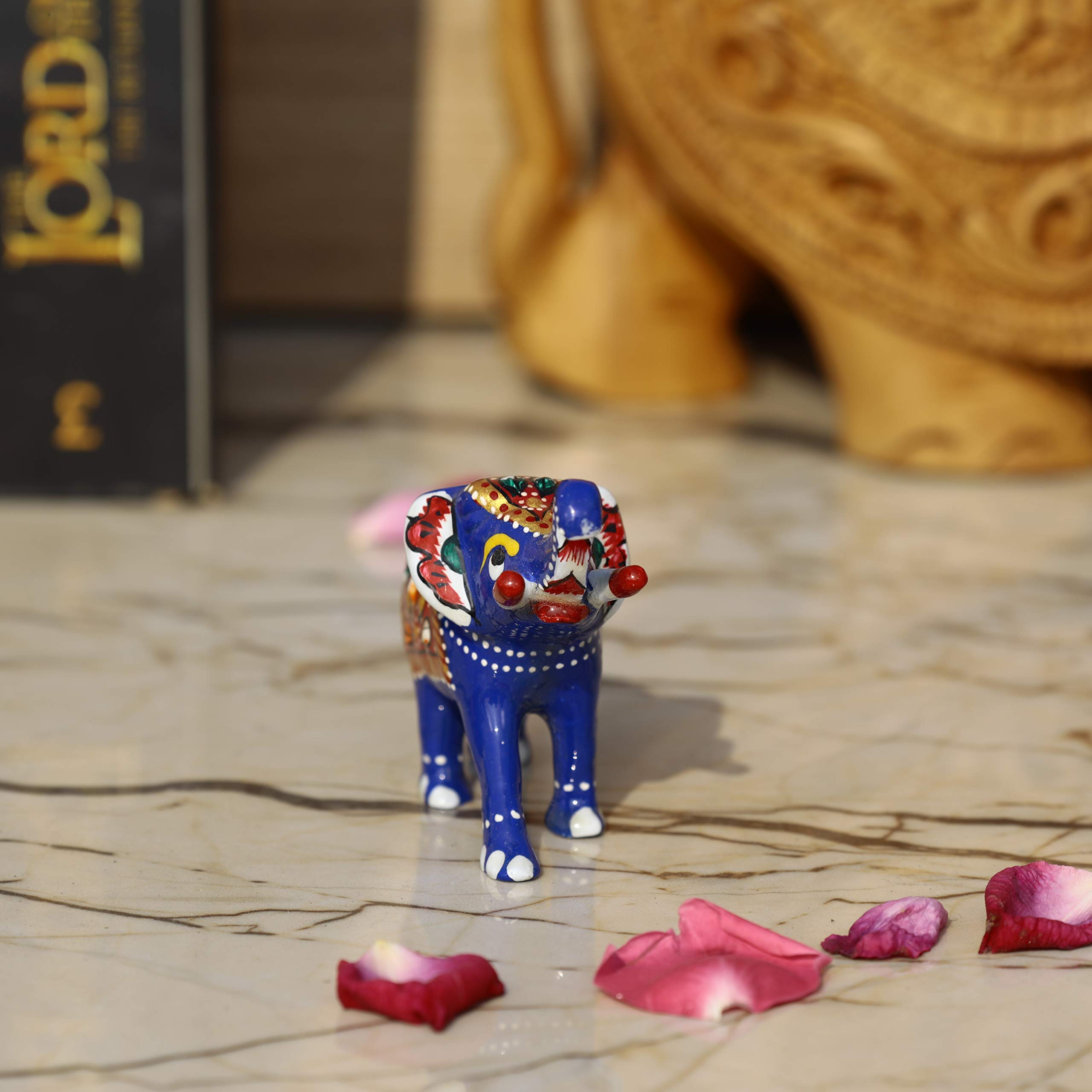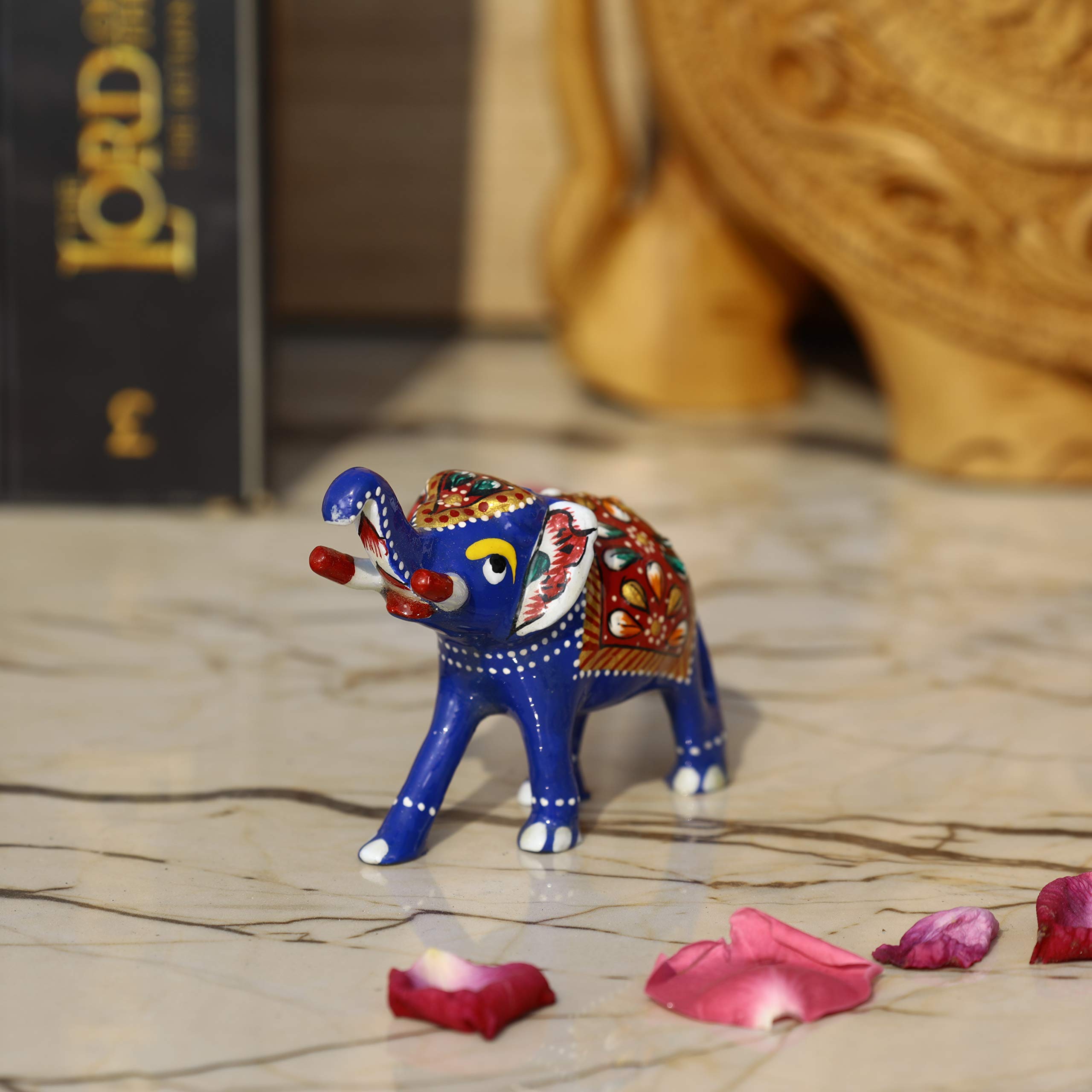 These traditionally Handcrafted Royal Metal Elephant from our "Meenakari Collection" has been deligently designed with execellent details and is decorated with finely polished jewellery clothing by fusing brilliant and rich colours over it. - It has been embellished with rich Meenakari work which makes the combo Graceful and the royal blue colour makes it attractive.