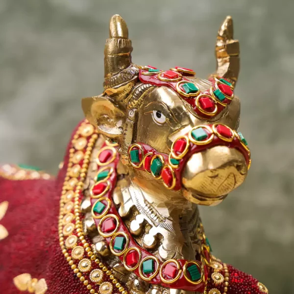 Exquisite craftsmanship: This Nandi Cow/Bull showpiece showcases exceptional craftsmanship with its intricate brass detailing and meticulous stone work. Each element of the sculpture is carefully crafted to perfection highlighting the skill and dedication
