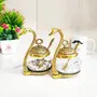 • Product contains: 2 Duck Shaped Glass bowl with 2 spoon and 2 cover Product Dimension: Length: 12 cm. Height: 15 cm. Width: 9 cm. Colour: Transparent Glasss Gold Table Décor Handicrafts saunf supari bowl for table duck bowl metal.