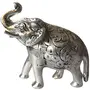 Beautiful white metal elephant with raised trunk. Add a touch of royalty to your living space with this beautifully carved showpiece. It is made by hand by expert Rajasthani craftsmen. Material: White metal. Finish: Oxidised silver. Dimensions: 10 cms x 10 cms.