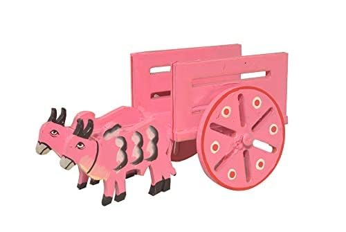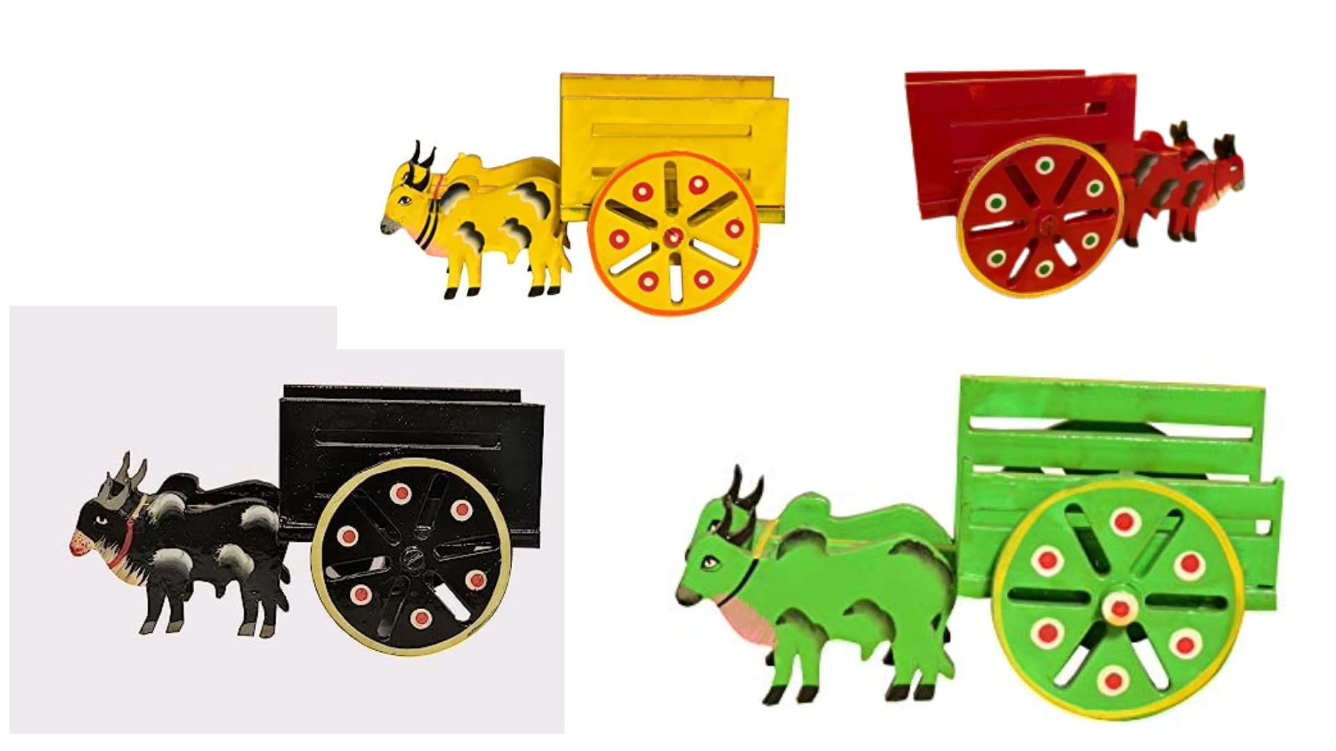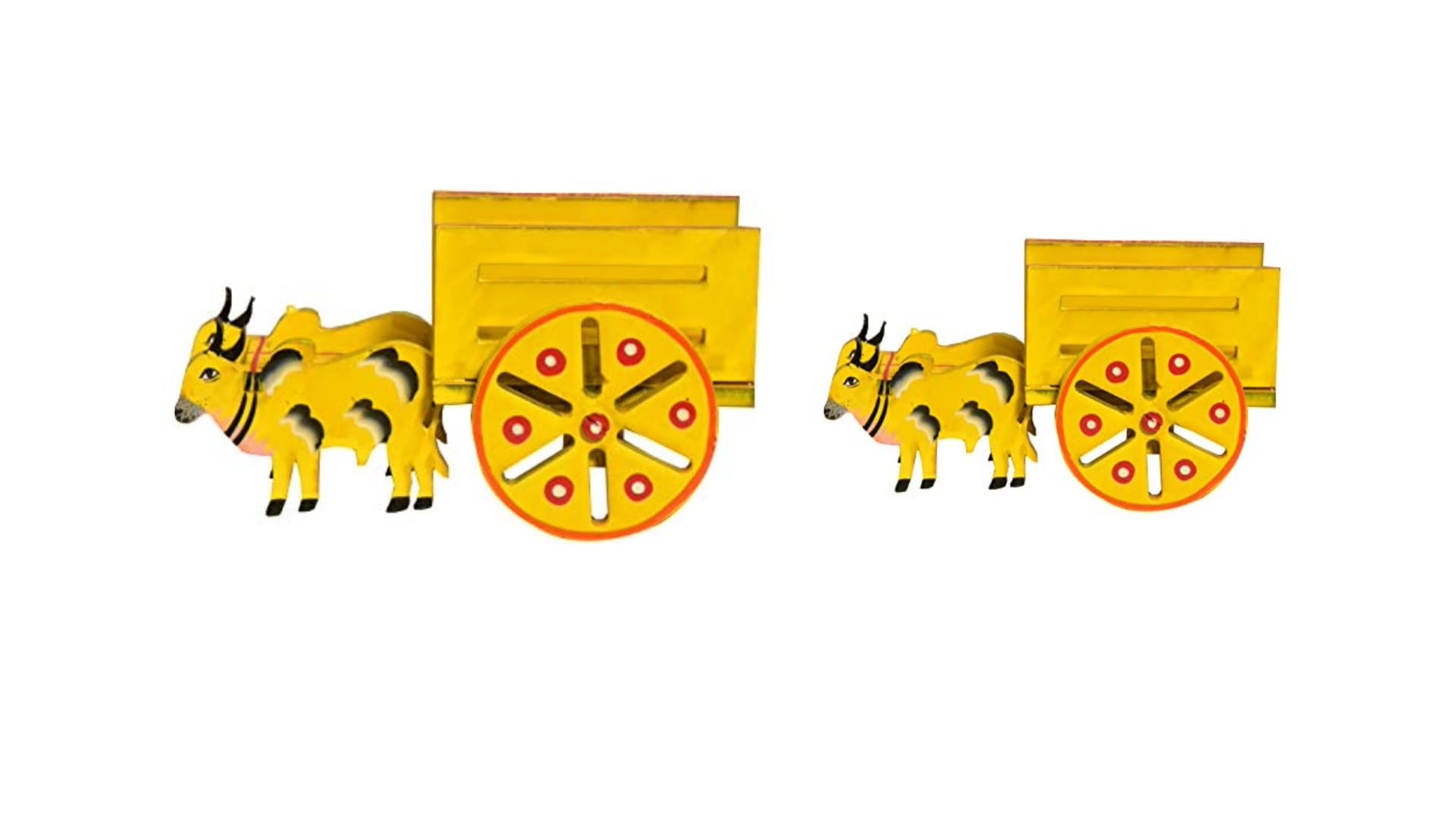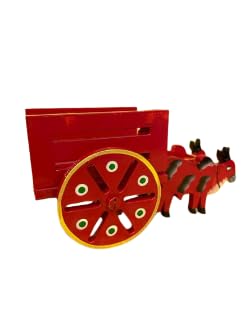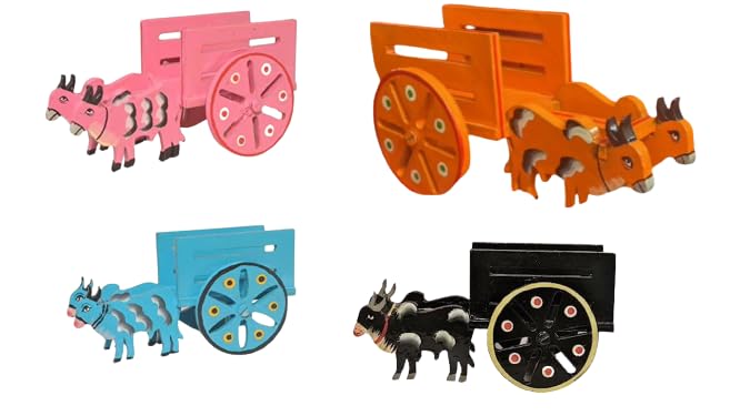 VARANASI WOODEN TOYS has added a new offer of colorful bullock carts: a set of 4. The village is the heart of Indian art and culture and the rural activities and culture are always reflected in the festivals of India whether it be in South North East or West..We may live in a metropolis or abroad or we may lead an ultra-modern and busy life but when festive seasons turn up we also turn to the village. The bullock cart spreads the vibes of a peaceful slow-paced happy life of the village and its festivals. Yellow Bullock carts pair are meant to decore the Golu Dolls decoration on Navratri. The Bullock cart set of two will give a graceful touch to your Golu Decor. Pongal the festival of village art and the festival of yellow hue. Hastishilp wooden beautiful handmade bullock carts set of 4 mattu vandis are also Ideal for toys. suitable for gifting purposes return gifts and Good for Golu decorations and Pongal and Sankranti village theme decor. The Yellow Bullock cat set of 4 is completely made of wood and handcrafted by rural artisans. VARANASI WOODEN TOYS artisans' imagination is intensively reflected in the bullock carts set. These adorable pieces of two bullock carts with the dimensions (L x W x H): 13.97 cm x 7.62 cm x 7.62 cm. will serve as a beautiful showpiece. These are the unique hand-painted antique handicrafts. It can be an excellent introduction to your child regarding the farming-related toy. Completely handmade by Indian rural artisans. CLEAN WITH A DRY CLOTH. NOTE: THE HANDMADE PRODUCT MAY VARY SLIGHTLY IN SIZE AND COLOR.