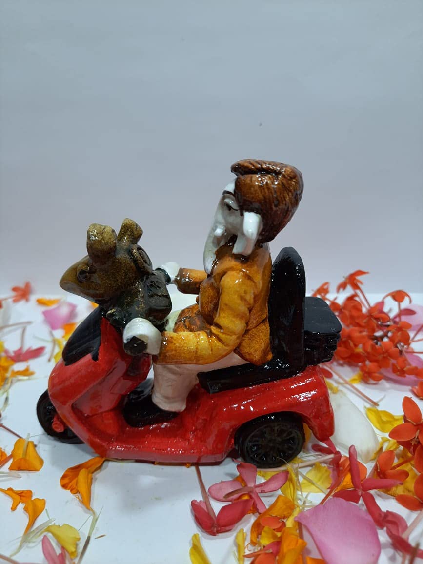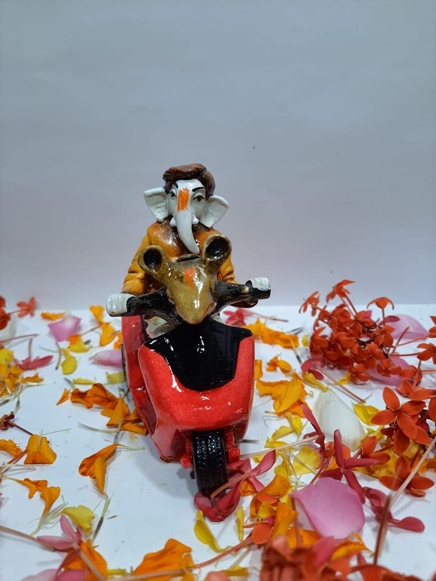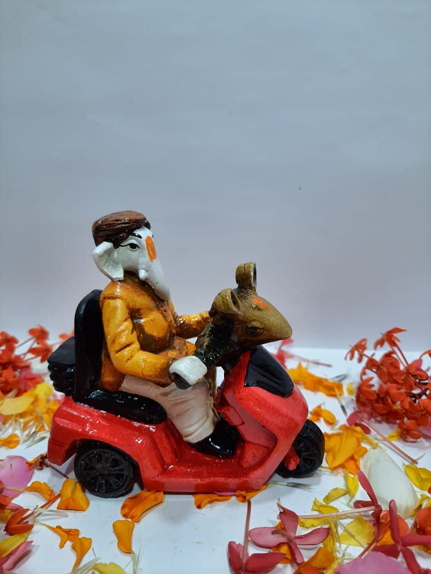 Lord Bal Ganeshji ride Mushak Scooter Handcrafted and Artifacts Idol for Home office and car dashboards. Place idol - guest room hall showpiece table and more can be gifted for house warming birthday parents day and more.