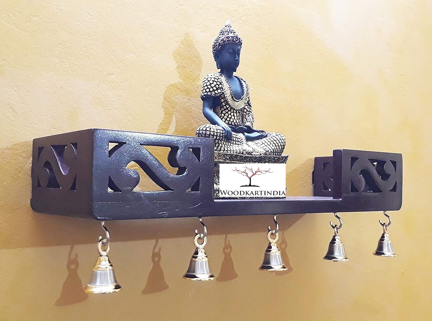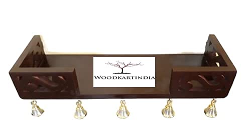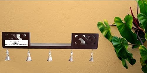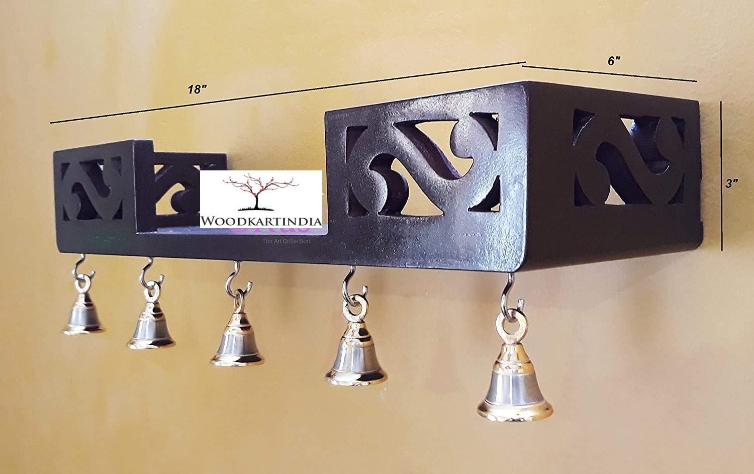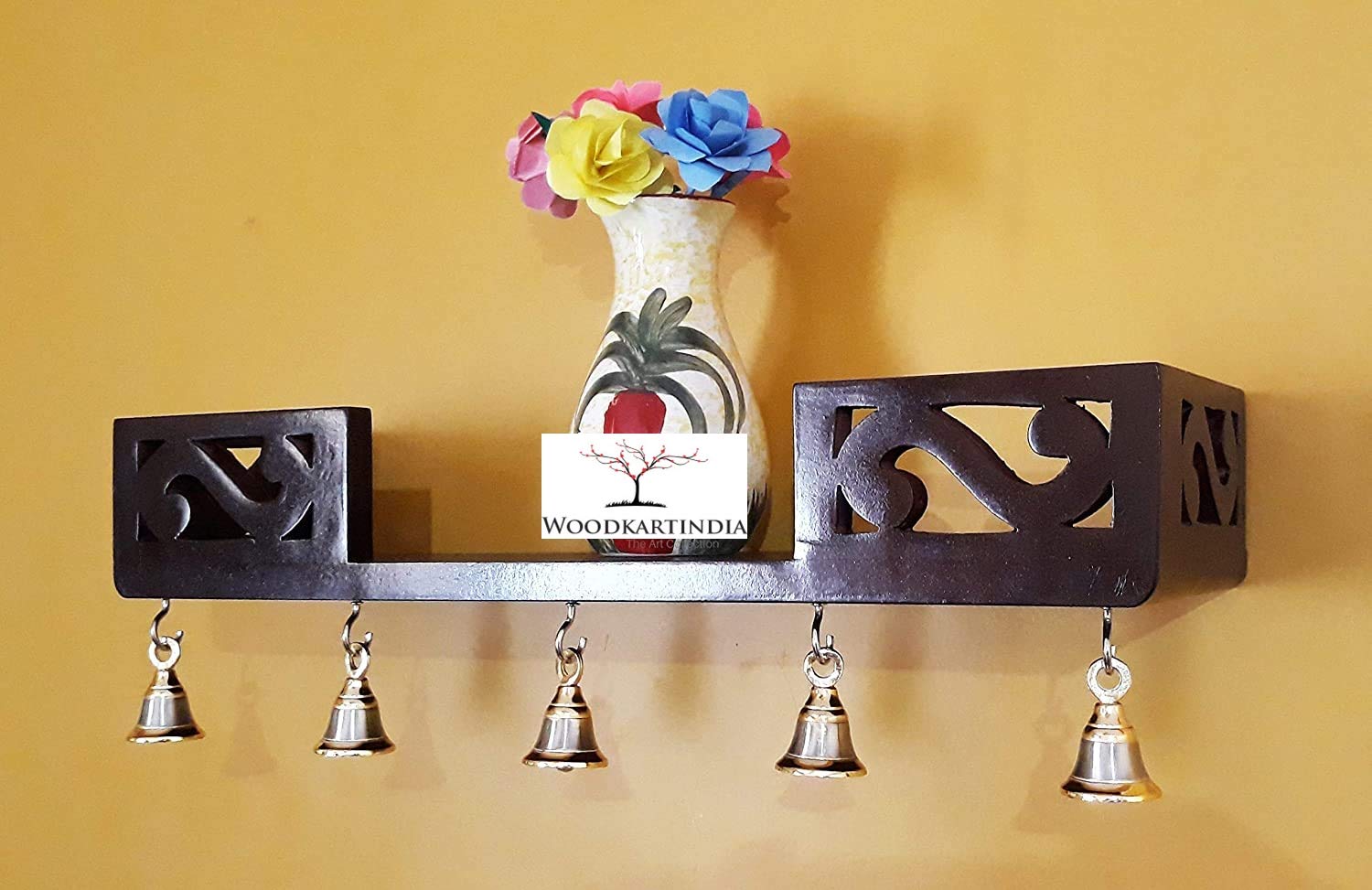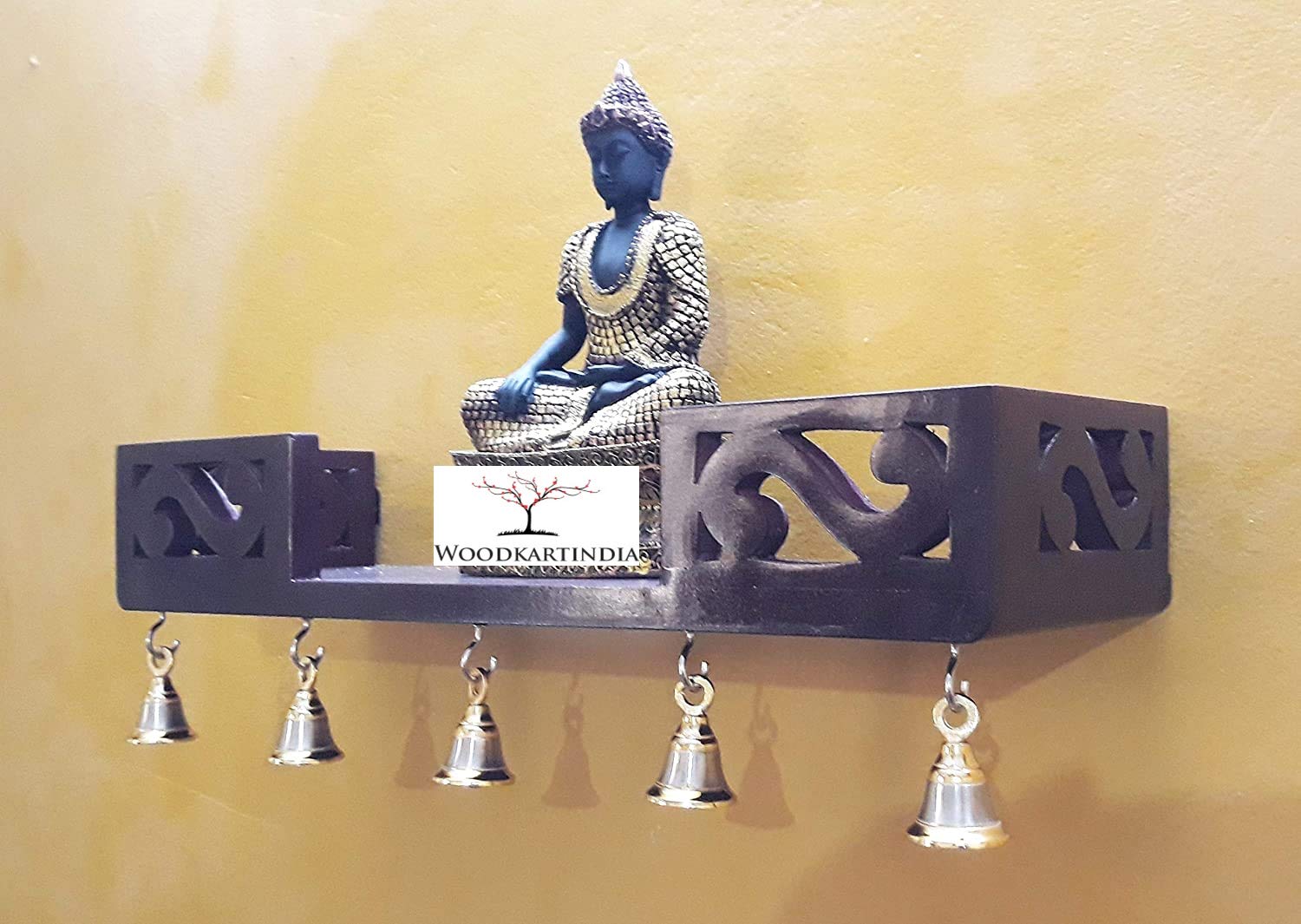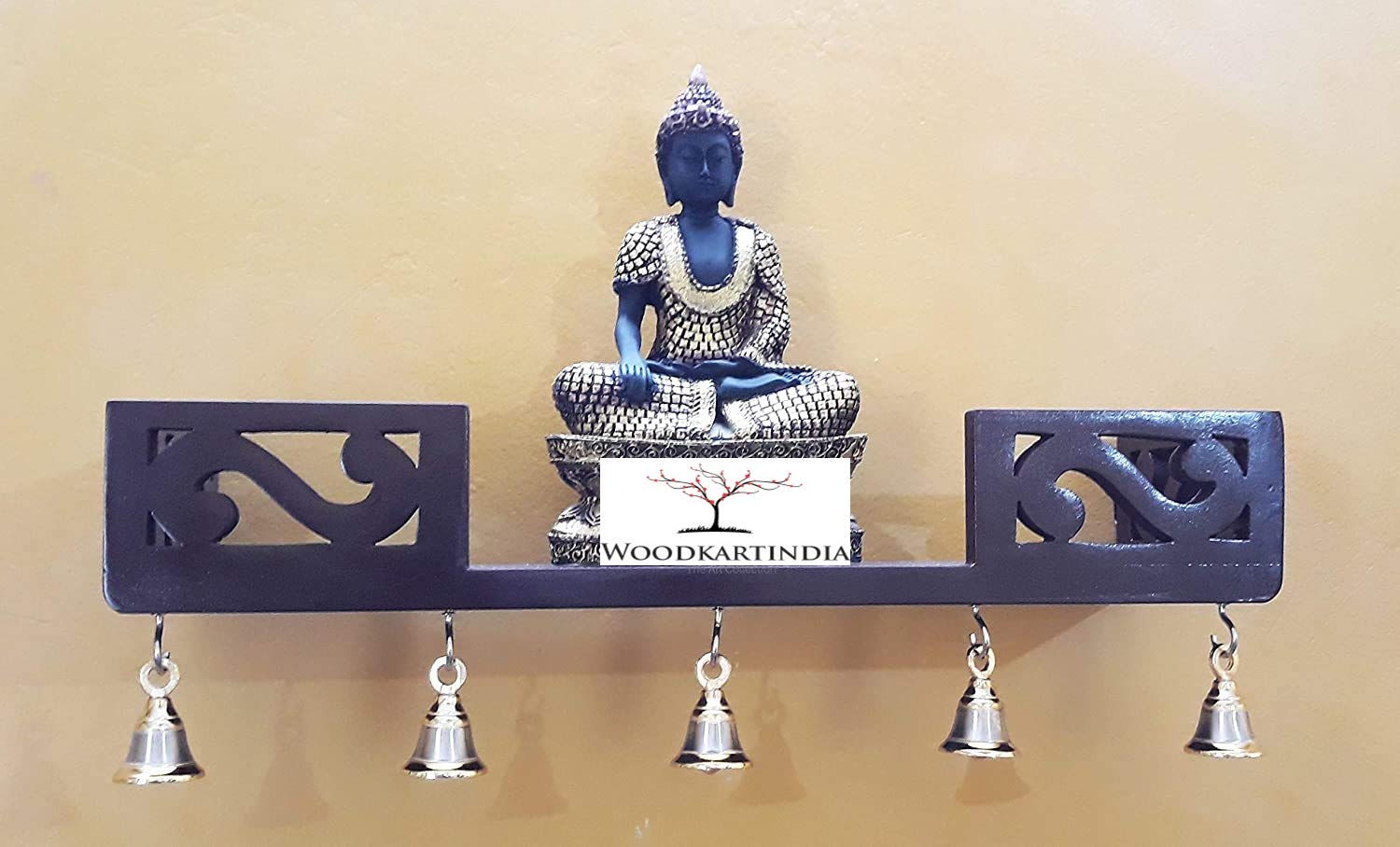 Woodkartindia temple ghar mandir shelfis made of compressed wood in premium finish style. This home temple shelf is exquisite design work on its finest quality wooden body that holds 5 decorative bells.