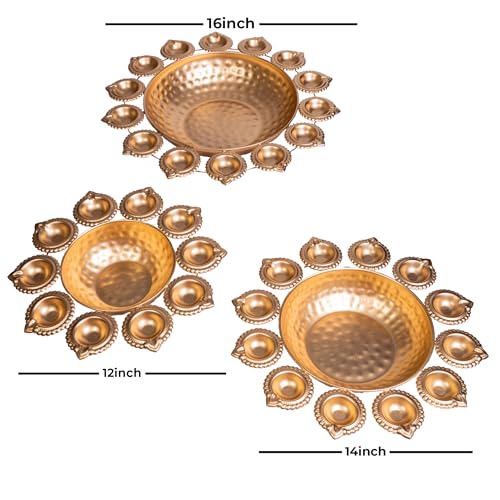 This Urli is made of metal and is sturdy and the metal urli do not bend or twist. It adds a vibrant touch to your indoor or outdoors when filled with flowers and T- Lights. The urli makes a handsome addition to the decor of any room and now you can enjoy the beauty of one that is made according to the time-honored traditions in your own home with the Handmade Metal Urli. Produced using sand casting techniques that have been passed down through generations of skilled metalworkers the Handmade Urli is a truly authentic Indian urli. To display the bowl in the traditional way fill it with water and then float living or artificial flowers on top. Add water to the urli mix a bit rose water and float flowers of your choice. Create a beautiful ambience by placing these urli in occasions. You can also place floating candles on the surface of the water. No matter how you use the Handmade Metal Urli you're certain to be impressed with its quality! Beautify your home with this traditional Indian decorative design. This urli is a perfect showpiece for those festive occasions when many people will visit you at your residence. Also to enhance its beauty even more we have a set of floating diya along with this urli.