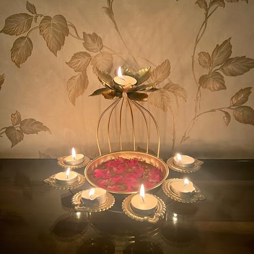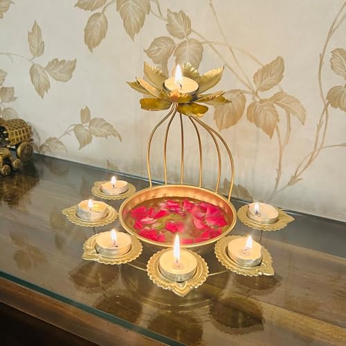 METTALLIC FINISH : The metallic finish adds to the beauty of the artefact and makes it a luxe addition into your interior. PRODUCT USE : Rose Urli Bowl for Home Decordiwali decoration items for home decor home decor items decorative items for homediwali diyas diwali decoration itemsFor water diyas for diwali DESIGN : Rose Diya Urli is patterned after the classic Indian design with intergrated handles and an attractive tappered shape. This can be displayed empty or filled with water to float candles or flowers CARE INSTRUCTIONS : Never use any harsh chemicals or never rub it with any rough surface Wipe it with clean piece of dry Cloth . IDEAL GIFT : An ideal gift and perfect for house warming and anniversary gifting as well.Great gift idea for anyone who appreciates beautiful handcrafted items for their home. Metal Urli Bowl with Diyas for Home Decoration Looking for a stylish and classic addition to your home dcor? Look no further than our beautiful decorative urli bowl! Crafted from high-quality materials and featuring an elegant design this bowl is perfect for displaying tea light candles flower petals or even potpourri. Its versatile style makes it a great addition to any room in your home from the living room to the bedroom to the dining room. With its smooth surface and durable construction this bowl is easy to clean and maintain