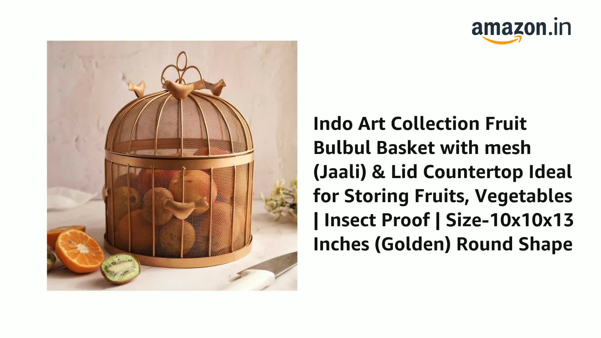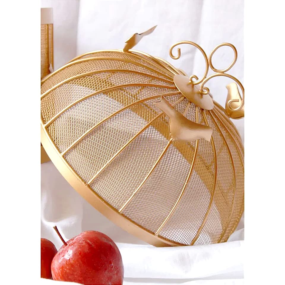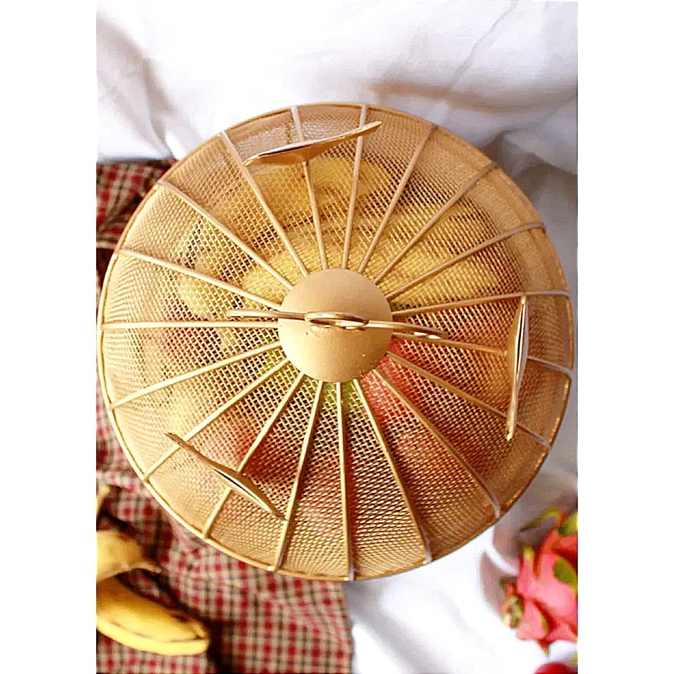 Indo Art Collection Fruit BulBul Basket with mesh (Jaali) & Lid Countertop Ideal for Storing Fruits, Vegetables | Insect Proof | Size-10x10x13 Inches (Golden) Round Shape