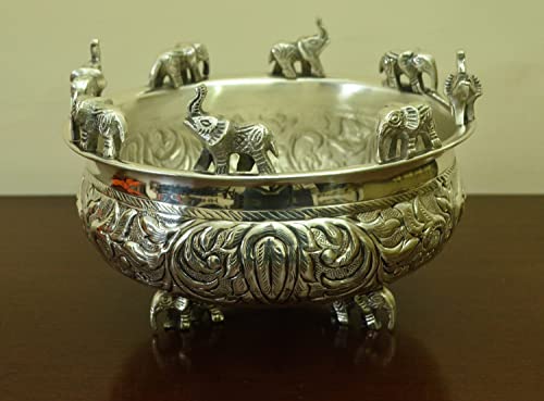Pure German Silver Hand Engraved Elephant Decorative Urli Bowl Pure German Silver Hand Engraved Elephant Decorative Urli Bowl for Floating Flowers and T - Light Candles for Home Office and Table Decor - Silver Color - 1 Urli Ideal decoration item for Indian Festivals Wedding Anniversary House Warming Christmas X-Mas New Year or any other family celebration. Do not clean with harsh chemicals or scrubber | Very intricate carving Delicately handmade and skillfully hand-painted by crafts people from the interiors of India