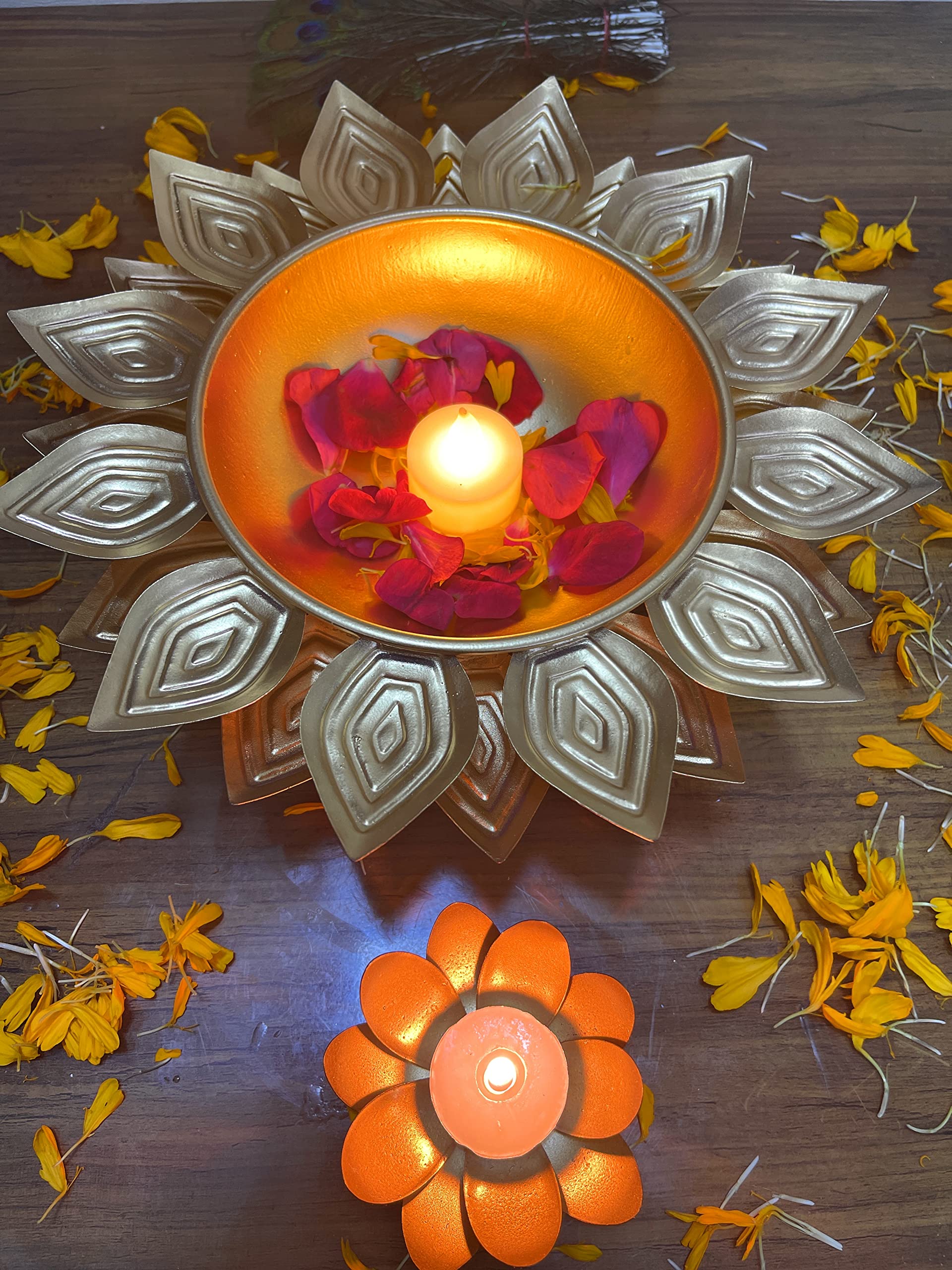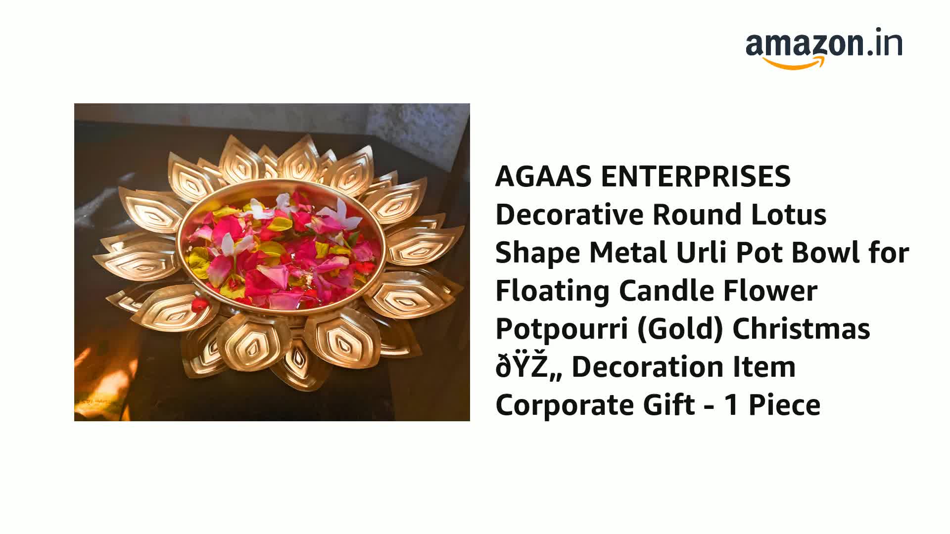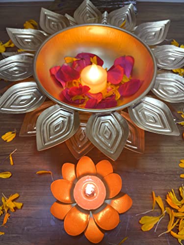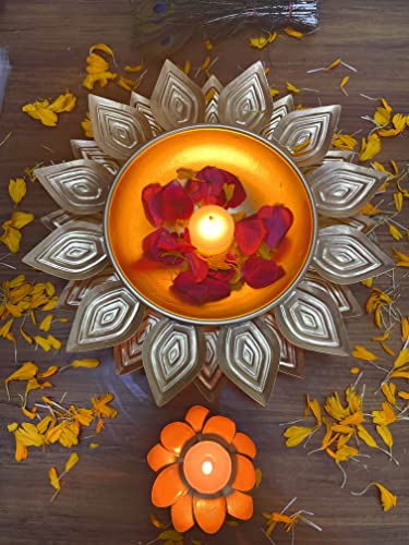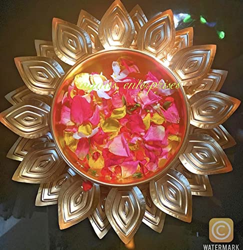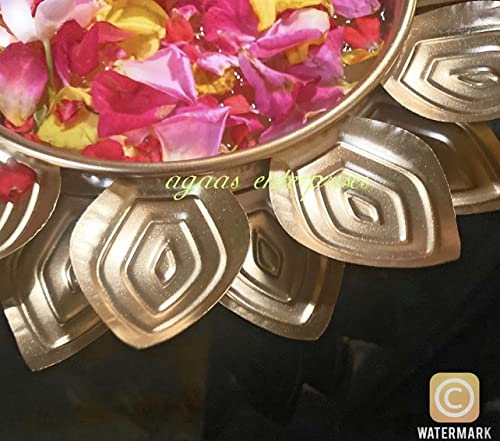 AGAAS ENTERPRISES Decorative Uruli bowl urli with metal lotus tealight holder diya holder handcrafted urli /uruli /urili or pot for floating candles or flowers SIze- 25 CM X15CM IN Dia . " Beautiful golden polish metal bowl for floating flower or candle for home decoration festival decor wedding look. Gift item Create a glow and colors buy putting candles or flower Patels in this uruli /urli pot centerpiece bowl Very beautiful crafted and golden in color a perfect Diwali or festival look and gifting idea .Dimension - 25cm x15cm. Perfect home decoration Diwali dcor Christmas and new year decoration and corporate gift item Beautiful designer urili bowl for floating flowers and candles Urli bowl for home decor Decorative diya lotus shape Diwali Decoration tealight candle holder . Best return gift . Packet contain 1 golden metal urli bowl plus metal lotus shape tealight holder .