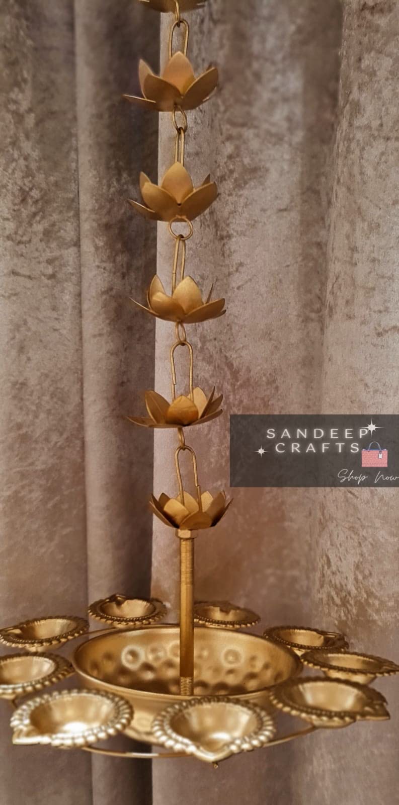 Material: Iron with Brass Finish Dimensions: Bowl width - 11.5 inches (29.21 cm) Height with chain affixed: 26 inches (66 cm) Package Contains: 1 Unit Of Designer Urli Showpiece for home decor and gifting Care Instructions: Use dry or wet cotton cloth to remove dirt.