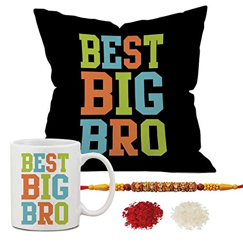 Christmas Vibes Best Big Bro Rakhi Gift Hamper Combo - 4pc (1 Cushion 1 Mug 1 AD Rakhi and Roli Chawal) Rakhi Gift for Brother Rakshabandhan Gift Rakhi Gift for Bhai