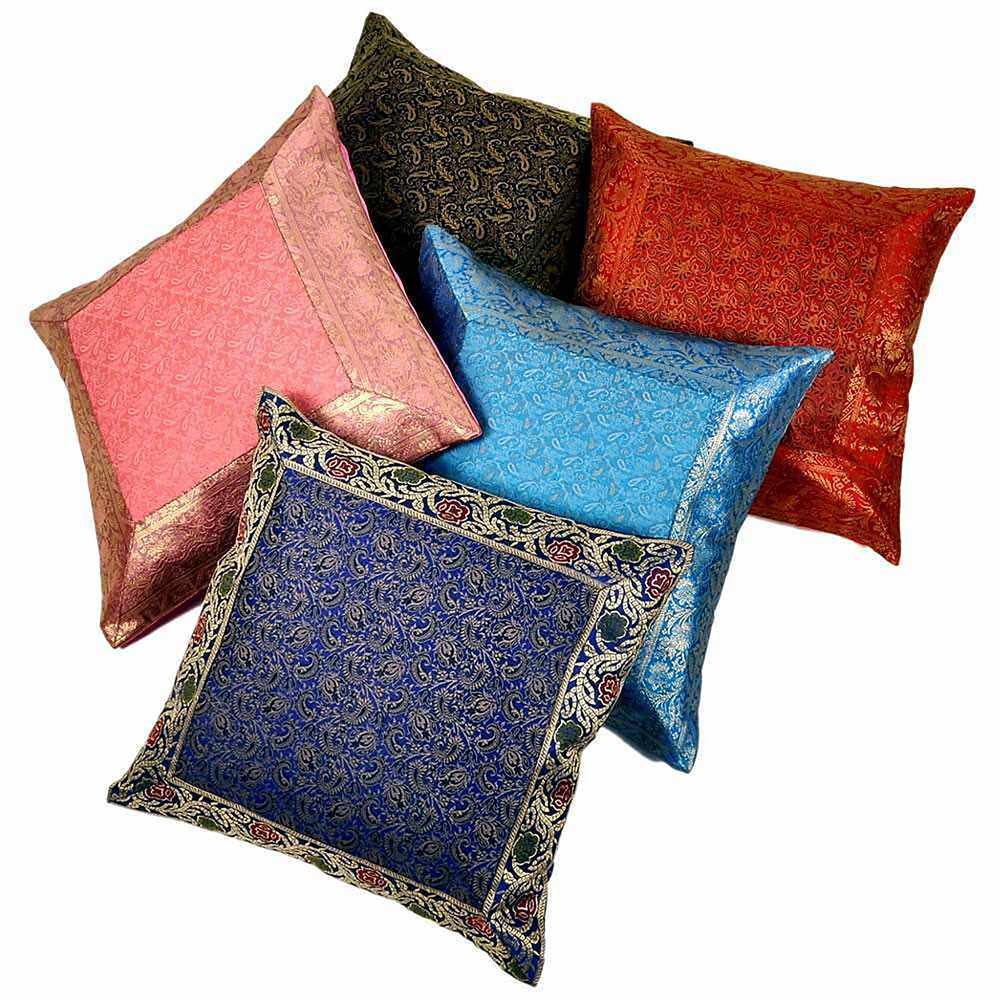 This multicolour 5 piece cushion cover set is made from brocade silk cloth. It is also decorated with assorted brocade laces on each cover adding shimmer to it. The golden zari work makes it look royal. These traditional and ethnic creations are the specialty of Rajasthan.