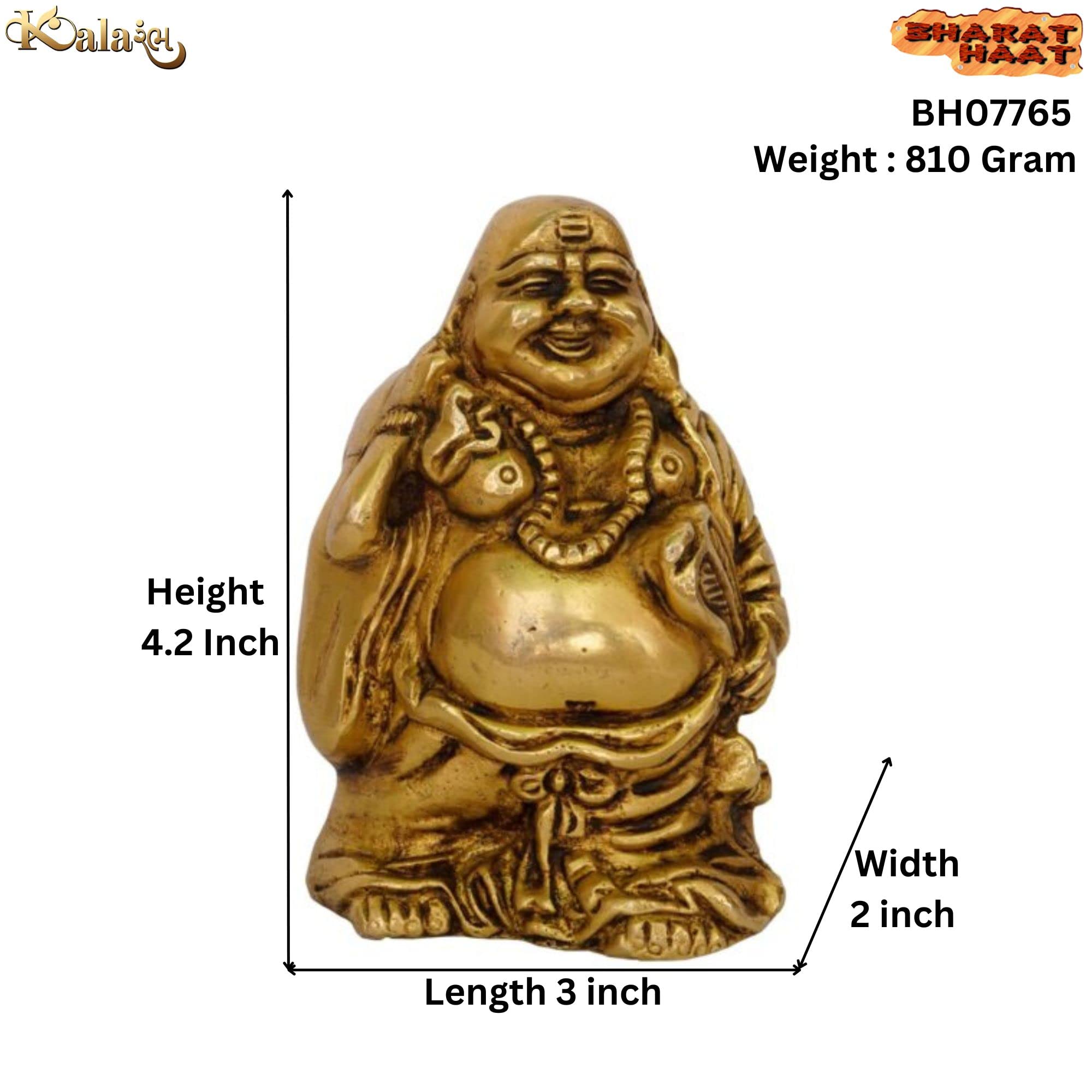 Kalarambh has been in the industry for two decades now. We are a manufacturer of Brass decorative products and export our products to other countries as well.We design develop and manufacture solid brass products such as home decor Pooja products living room and art decor products.Our quality is what we are known for. We do not compromise our product quality. We have an in-house team that manages all our design aspects and work closely with the current trend.Size: 3 x 2 x 4.2 inch (LxWxH); 7.62 x 5.08 x 10.668 Cm (LxWxH)Package Contain: 1 x Laughing Buddha
