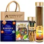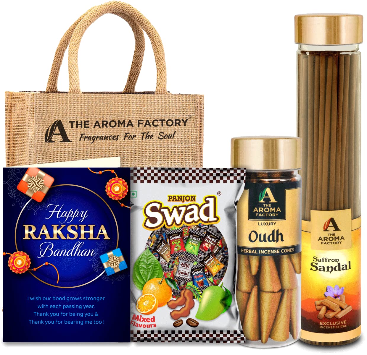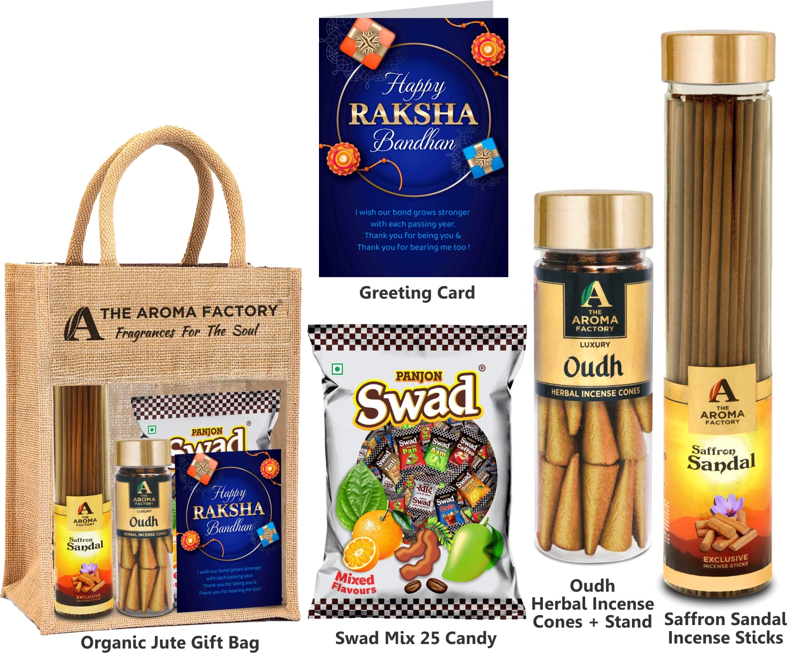 The Aroma Factory Happy Raksha Bandan Gift Hamper Set (Swad Mix 25 CandyKesar Chandan Agarbatti Mogra Dhoopcone Greeting Card Jute Bag) Gift Item
