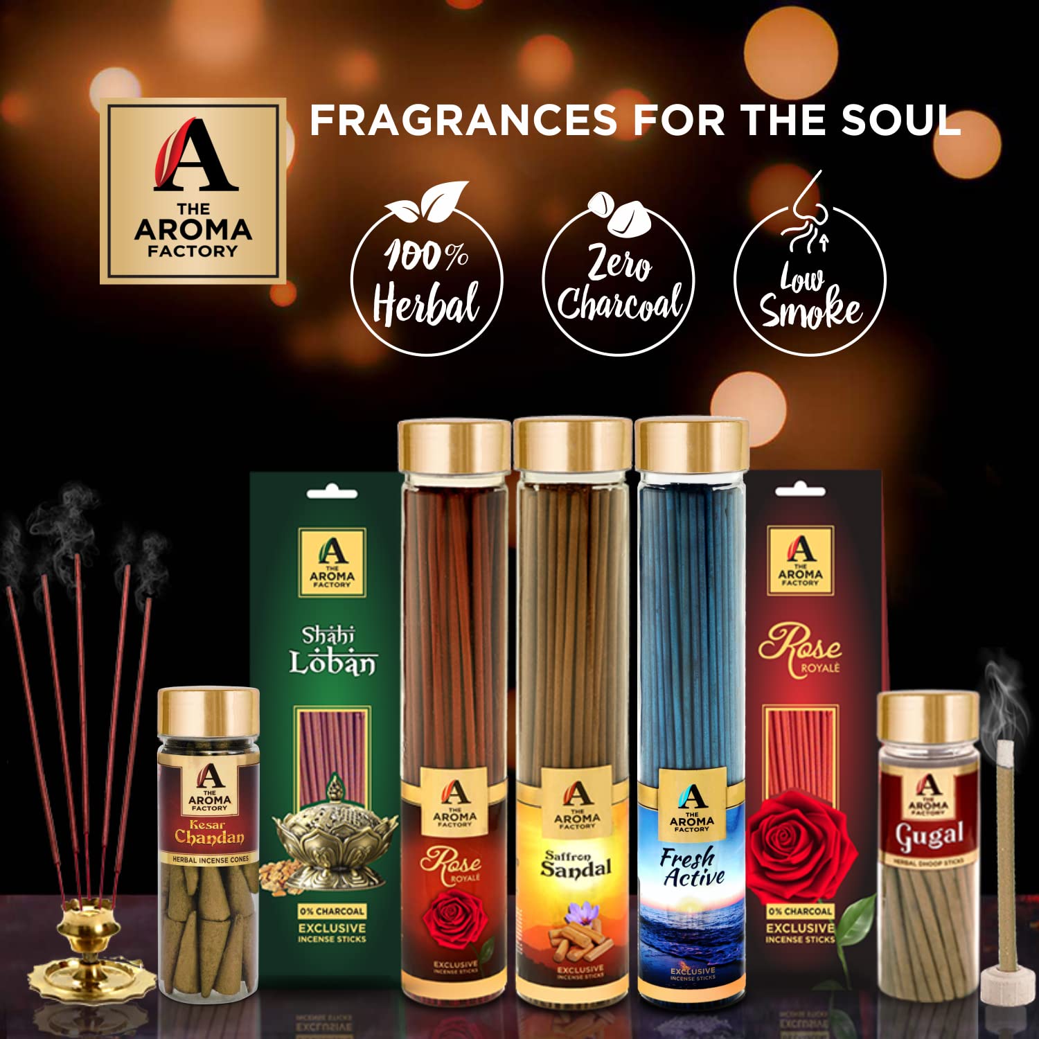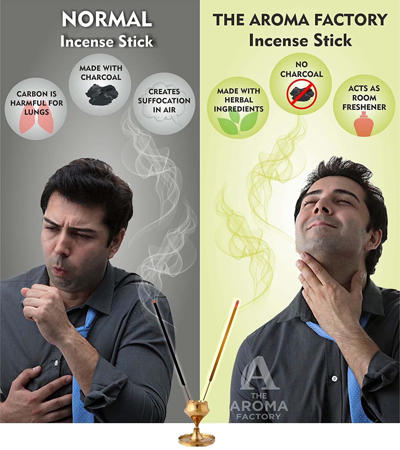 The Aroma Factory: 100% Herbal Sticks. Made with 0% Charcoal freshens the air and neutralises unwanted odour.Low Smoke & Long Sticks - 9 inches made with Aromatic Essential Oils for Soothing Fragrance.