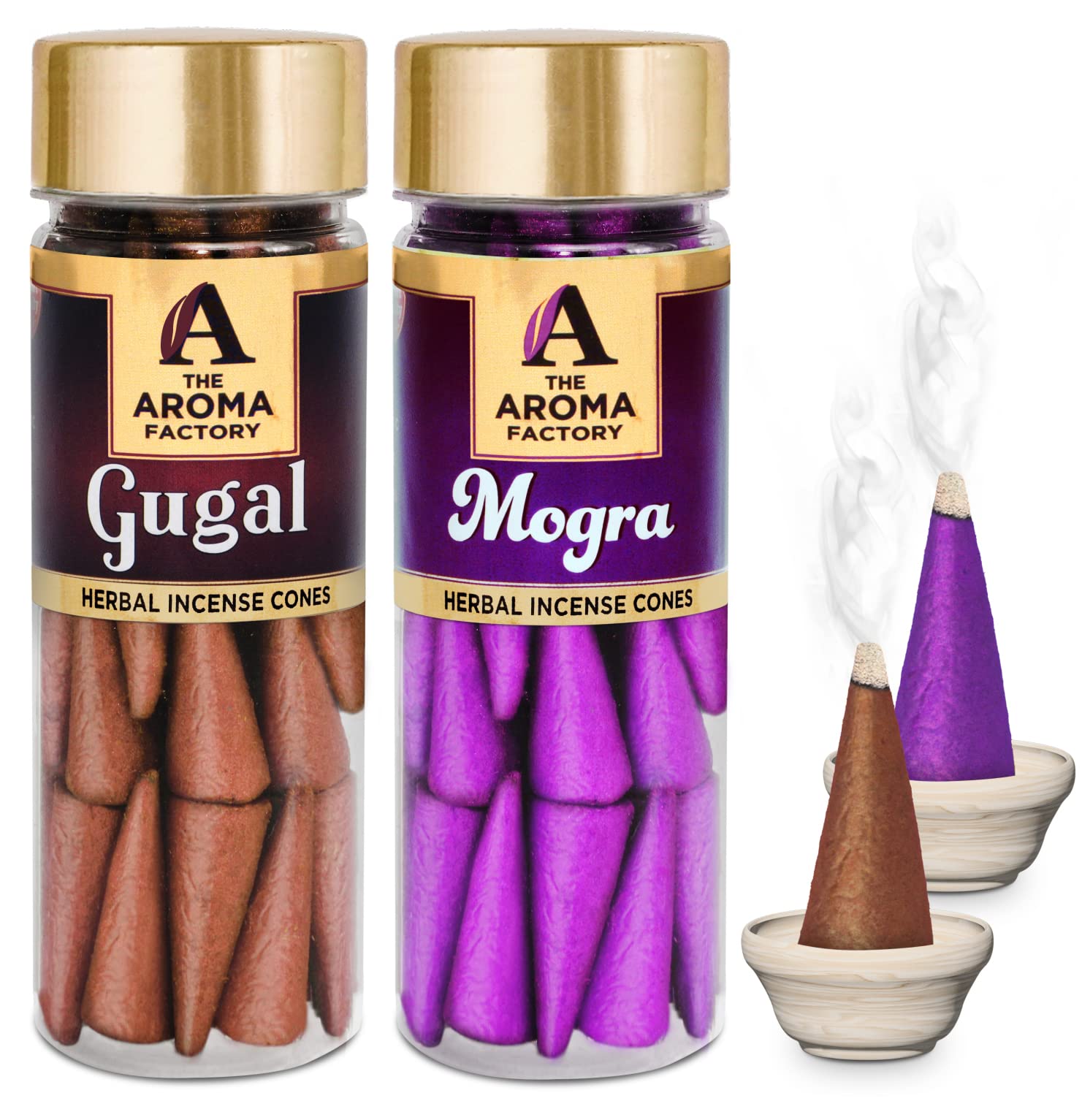 The Aroma Factory Incense Dhoop Cone for Pooja Gugal & Mogra (100% Herbal & 0% Charcoal) 2 Bottles x 90g