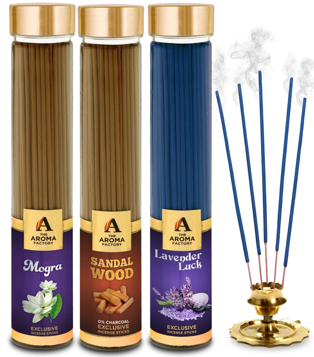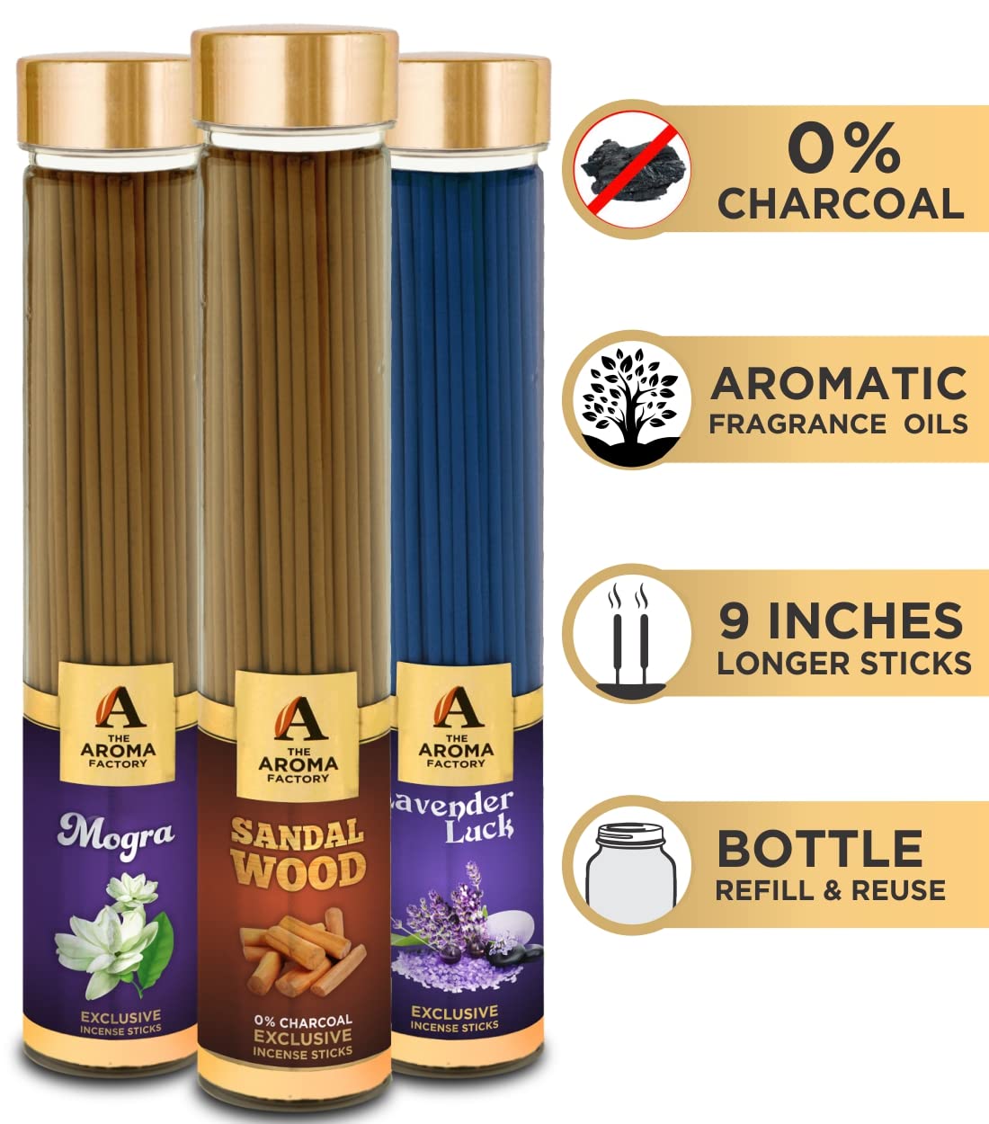 The Aroma Factory Mogra Sandalwood Chandan & Fresh Lavnder Incense Stick Agarbatti (Zero Charcoal & 100% Herbal) Bottle Pack of 3 x 100 Experience the Soothing Scent of Exclusive Incense Sticks Agarbatti by The Aroma Factory - A Quality product by Panjon Limited. Fragrances specially curated to Rejuvenate your Senses and Calm your Soul. Made with Natural Essential Oils and 0 percent Charcoal Content indulge in the Soothing Aroma of Incense Sticks by The Aroma Factory. Try all fragrances of Agarbatti and Dhoop Batti by The Aroma Factory : Chandan Loban Gugal Mogra Rose Lavender White Sage Sandalwood Attar Jannat Ul Firdaus Citronella Patchoulli Chocolate Green Apple Strawberry Pineapple Jasmine.Incense Sticks Agarbatti sandalwood agarbathi agarbati dhoop dhoopbatti dhoopbati dhoop batti agarbathies incense stick incense sticks aroma meditation pooja puja charcoalfree. Suitable for gifting : Add more aroma to your loved oneâs life by getting them these fragrance sticks on occasions such as Diwali Rakhi and other festive events. 100% Quality Assured.