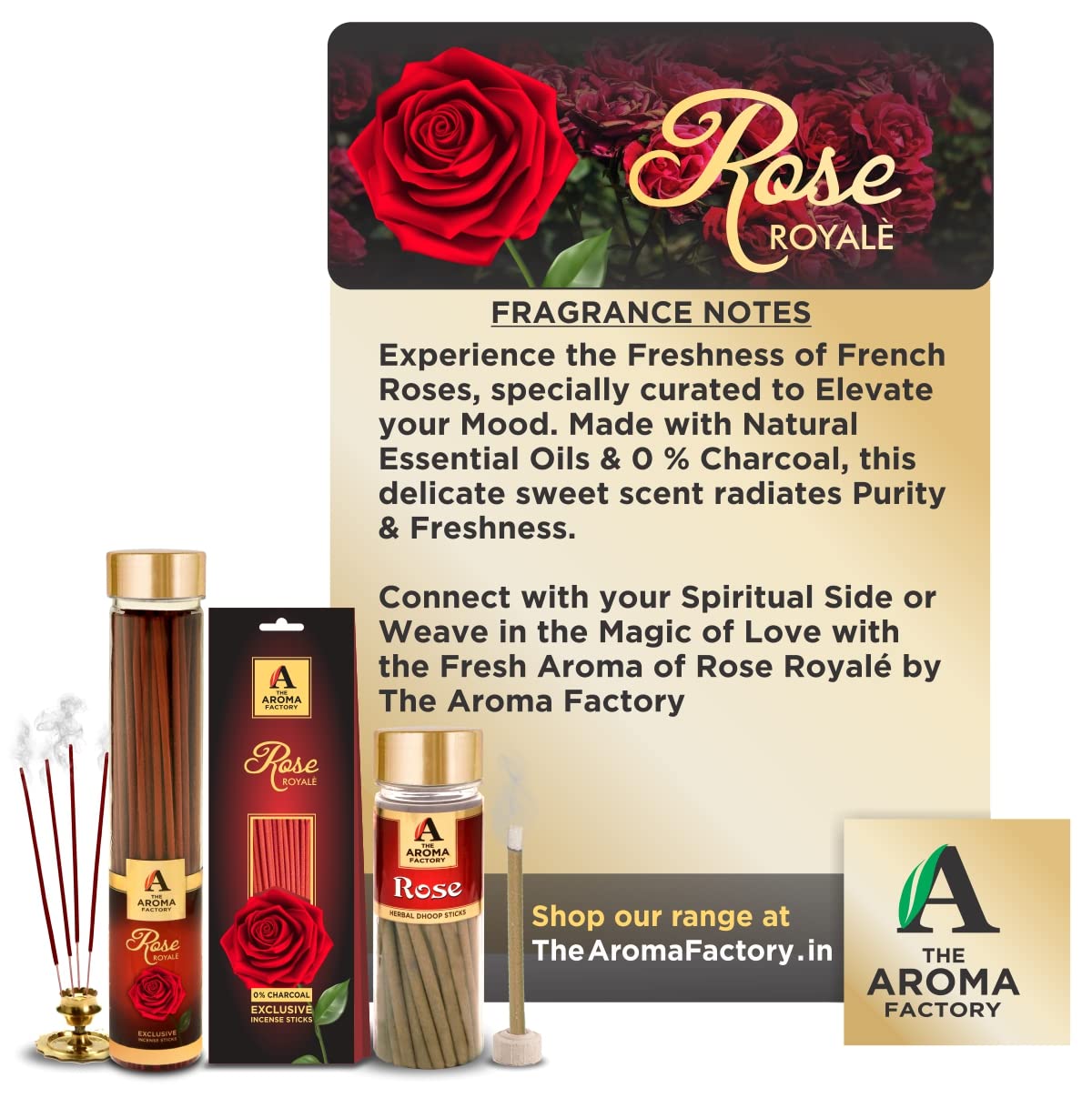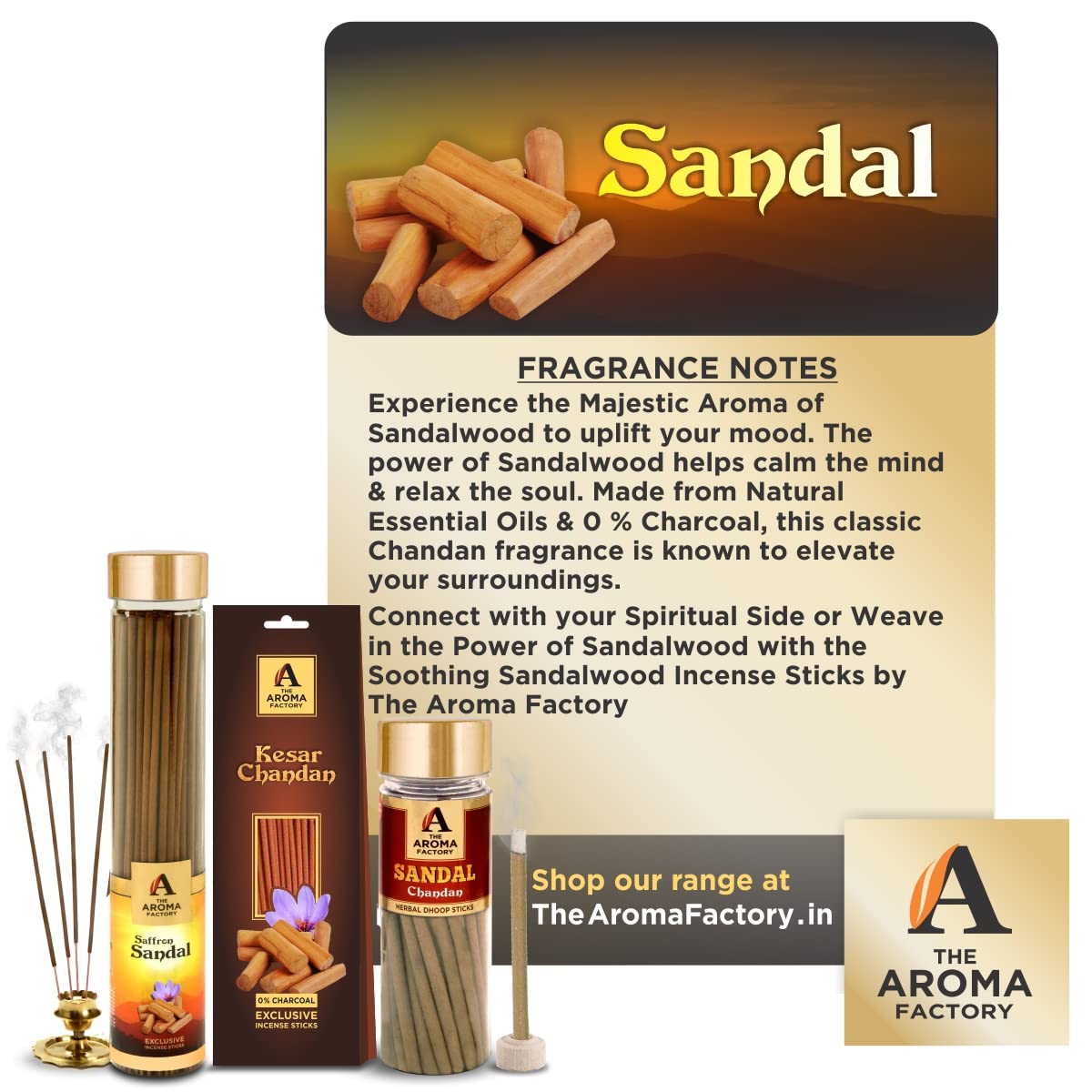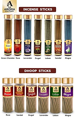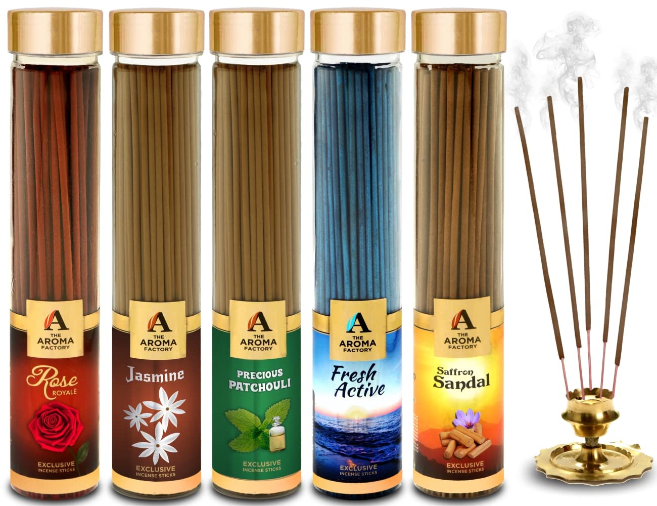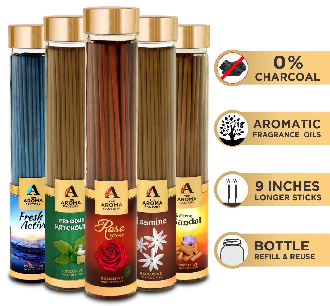 • The Aroma Factory Rose Jasmine Fresh Active & Kesar Chandan Incense Stick Agarbatti (Zero Charcoal & 100% Herbal) Bottle Pack of 5 x 100 with an invigorating and refreshing fragrance.