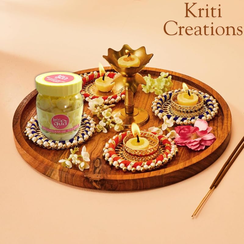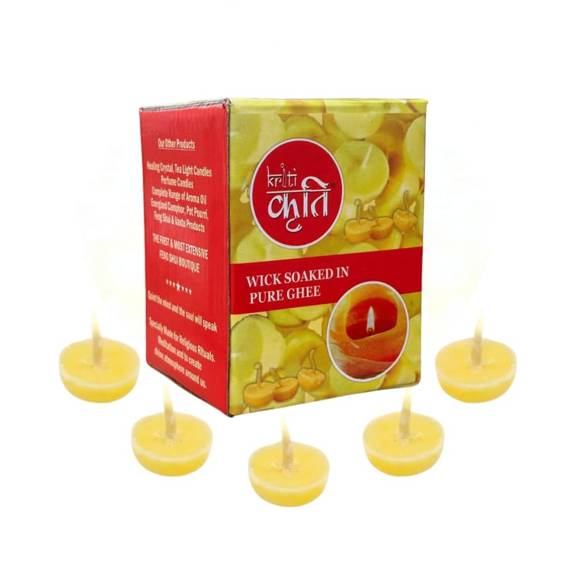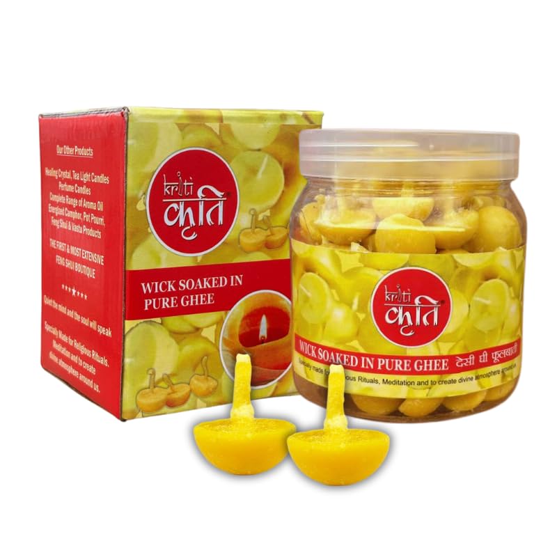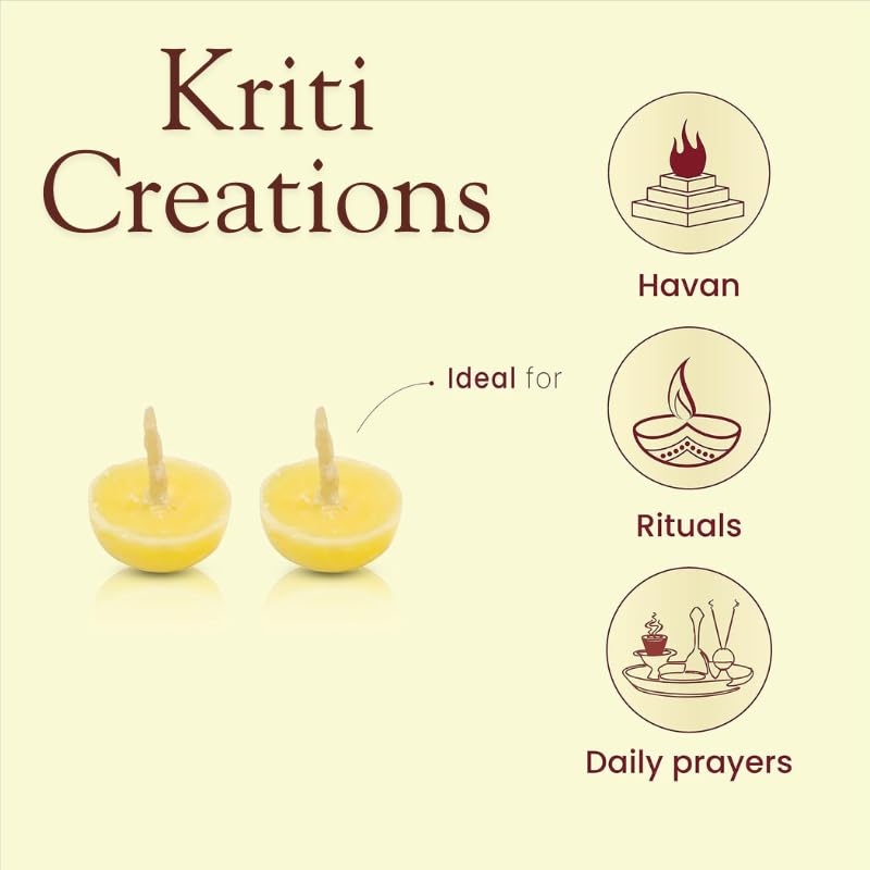 Kriti Creations Pure Desi Ghee Wick Burning Capacity up to 30 Minute (approx). Content : 100 pcs Burn Time : 1/2 hour Per Wicks Dimension : 3.5cmx2.5cm Gross Weight = 270 gm (approx)